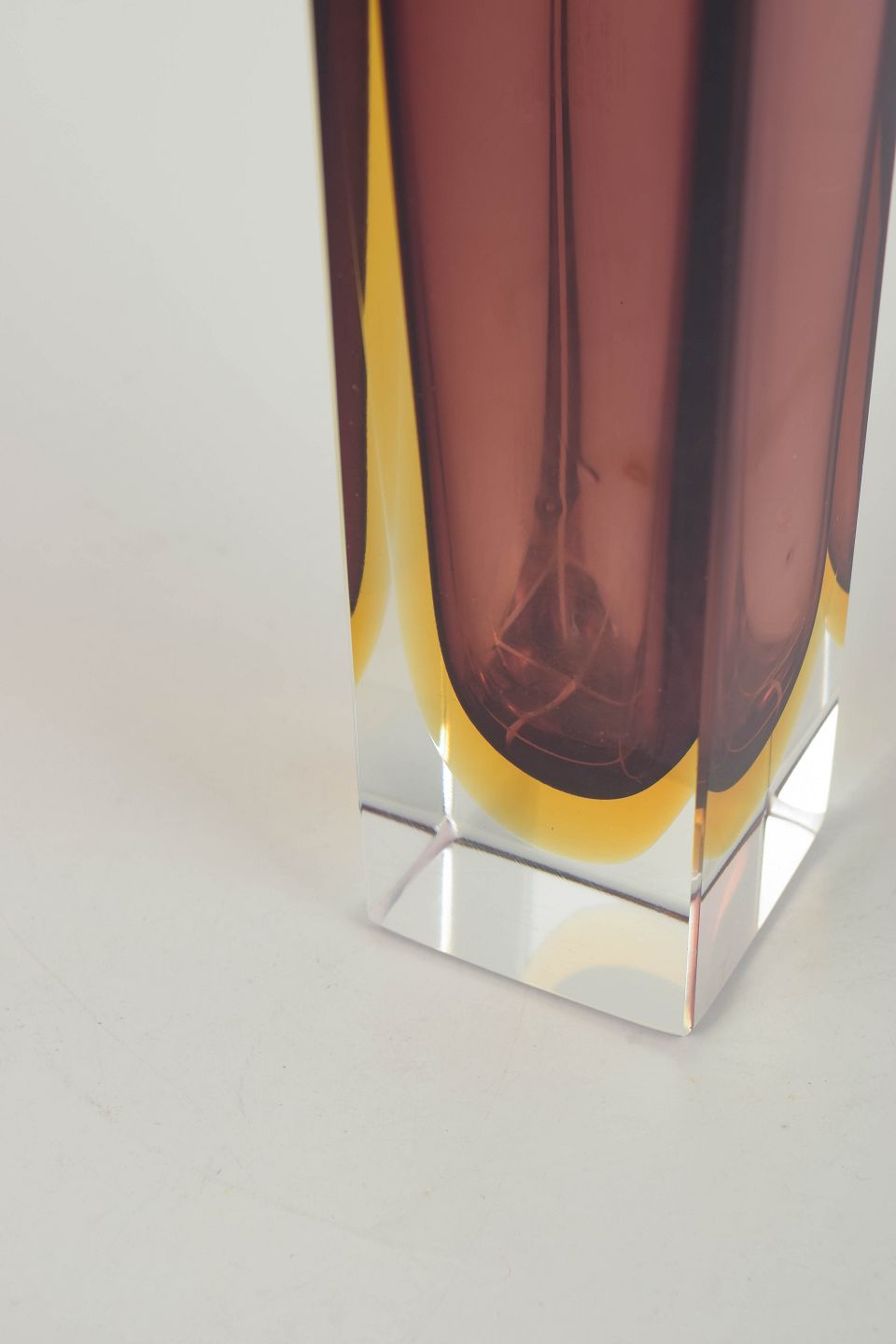 Rektangulær Murano-vase i lagdelt sommerso-glas med klar ydre krop, dyb ametystfarvet indre kerne og varme gule overgange. Et elegant eksempel på 1960’ernes italienske glasdesign, kendetegnet ved skarpe linjer og optiske farvespil.