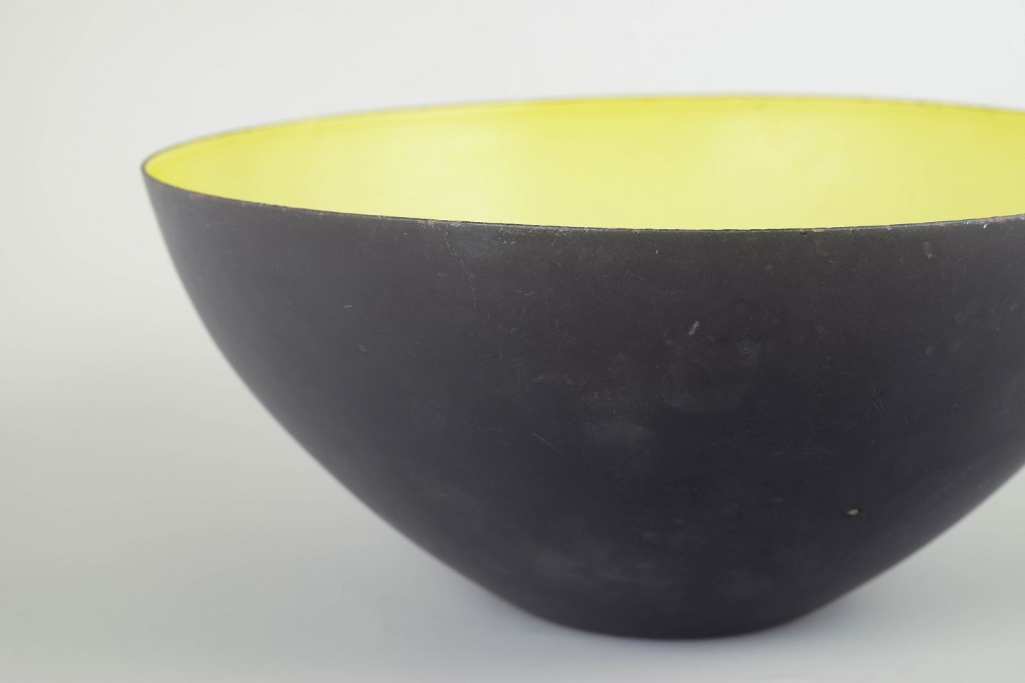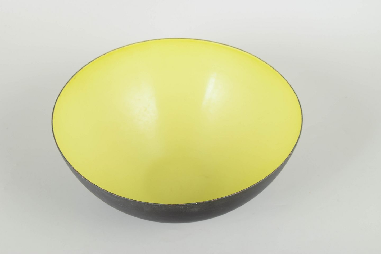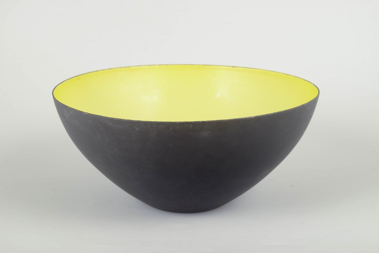 Klassisk dansk designskål i sortlakeret metal med emaljeret inderside i en sjælden gul farve. Den ikoniske halvkugleform giver et skarpt, minimalistisk udtryk, karakteristisk for Krenit-seriens tidløse design.
