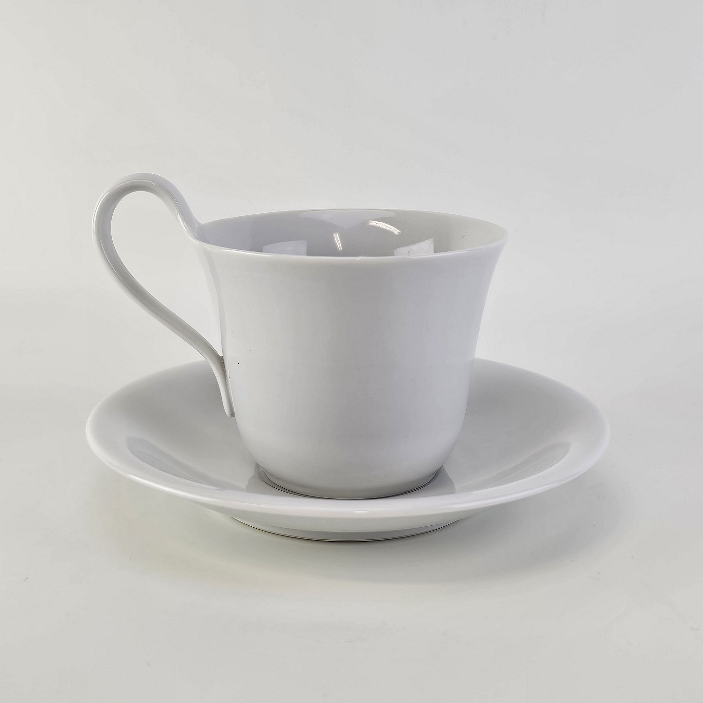 Kop med høj hank og underkop i glat hvidt porcelæn