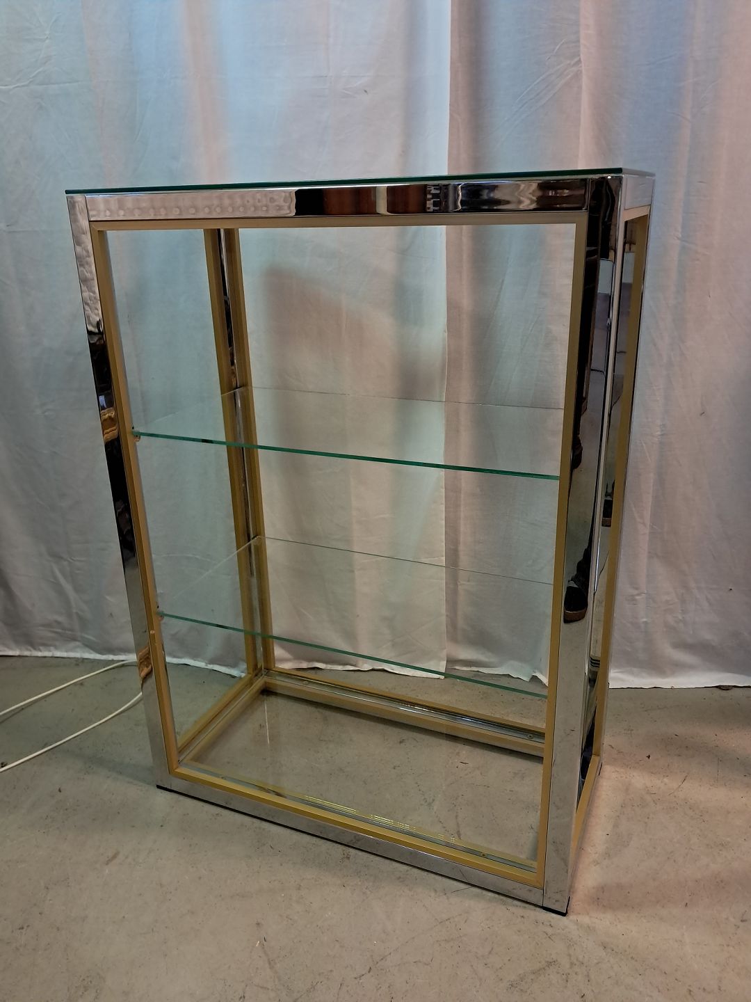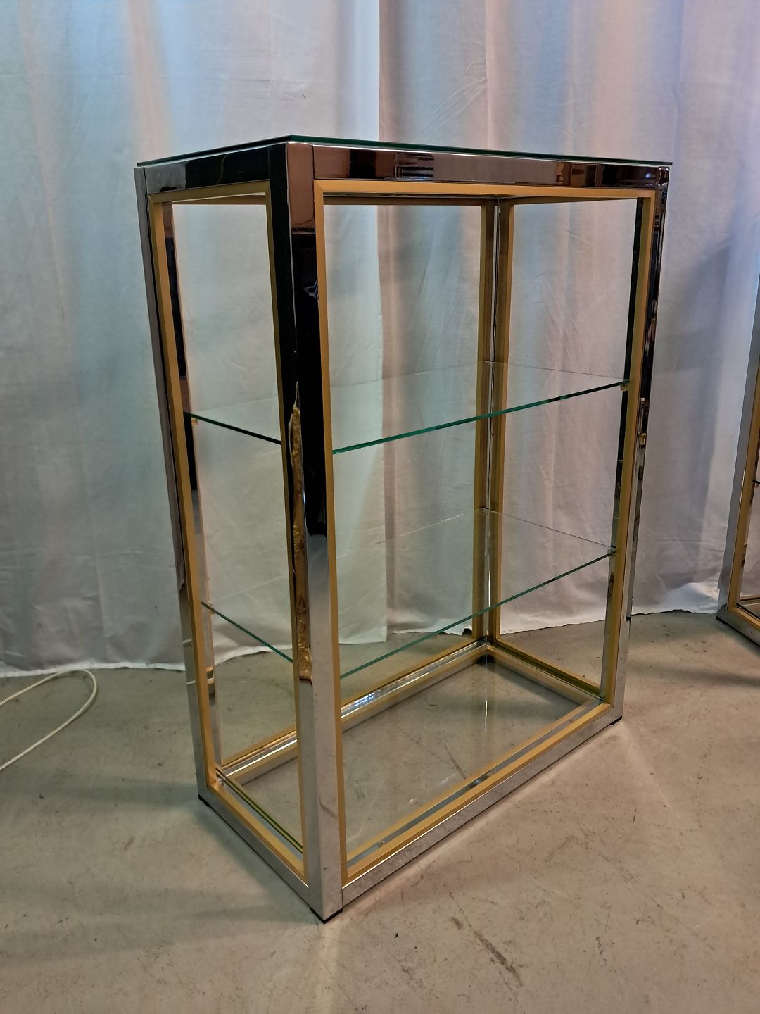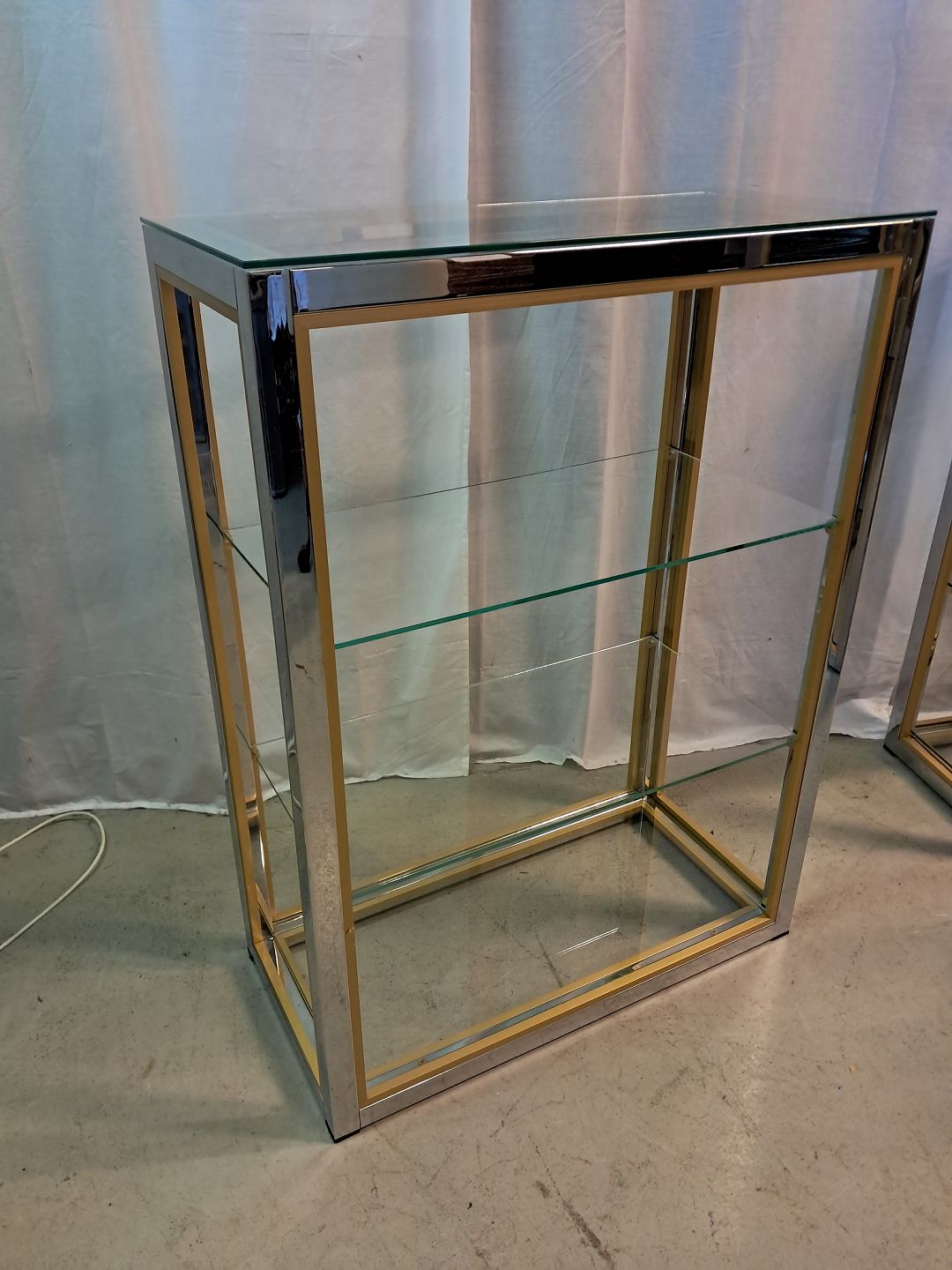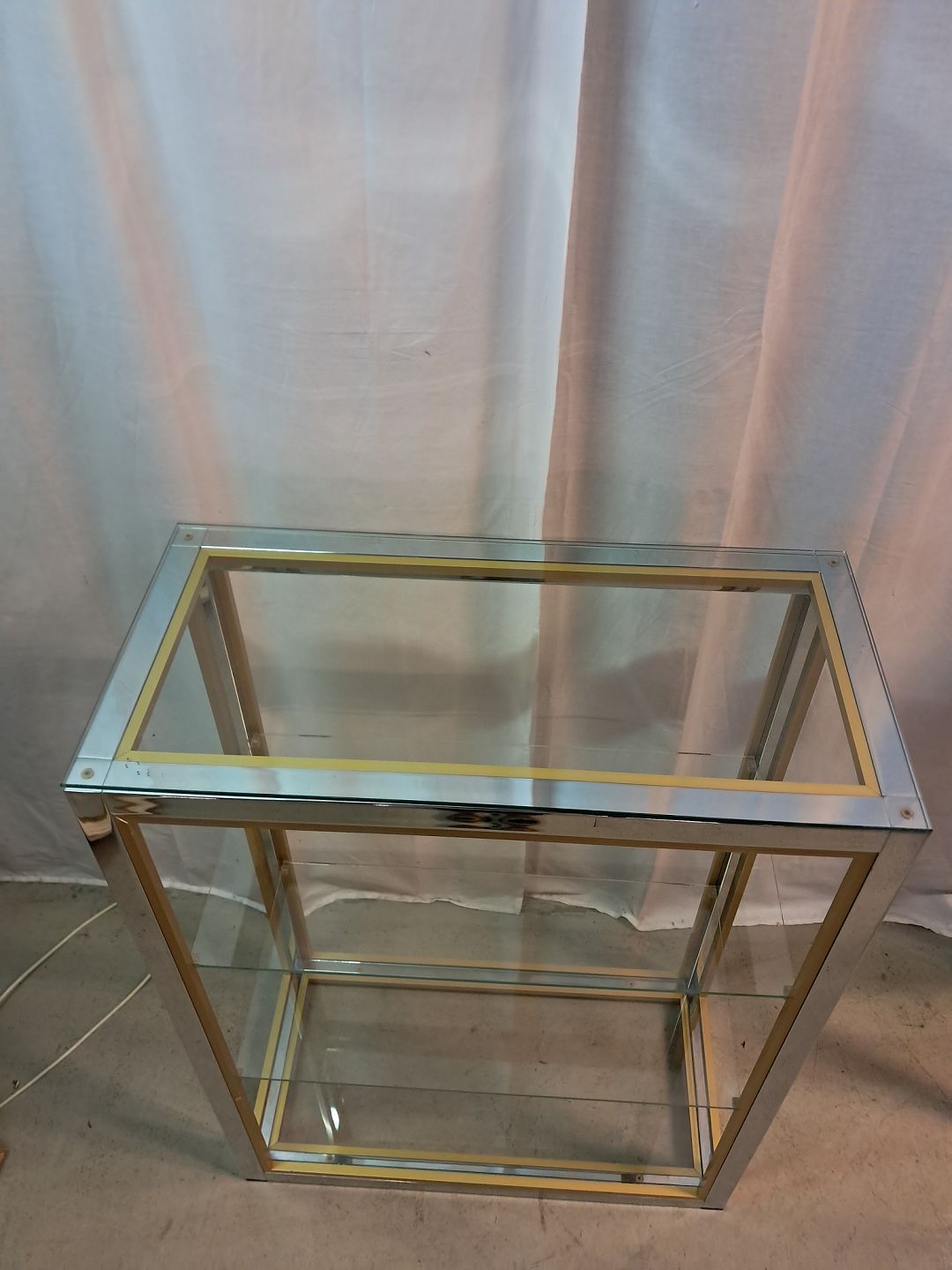 Forkromet reol i metal med glashylder, fra 1980erne.