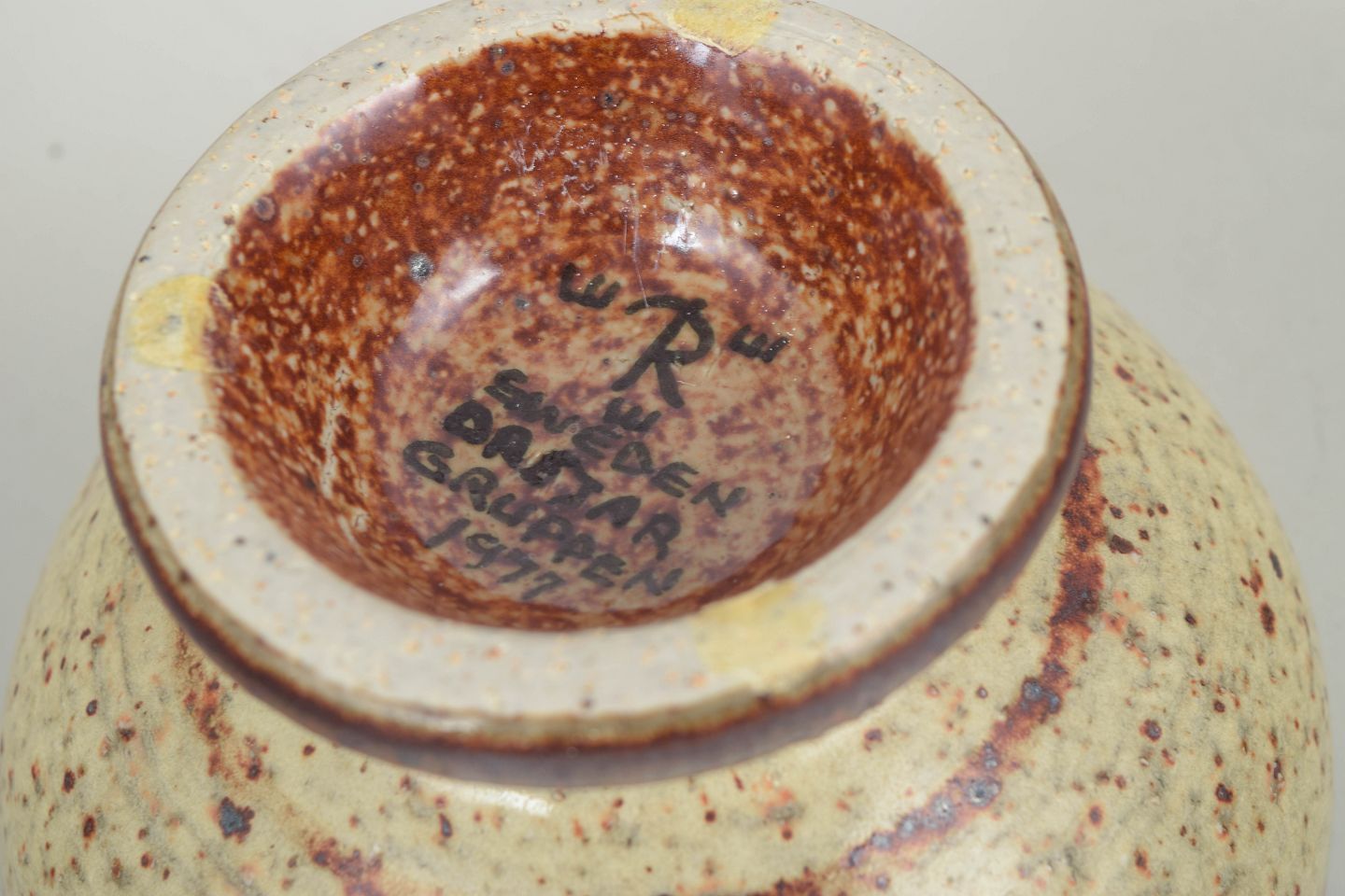 Drejet stentøjsskål med fod og en varm, plettet lys glasur med brunlige detaljer, typisk for Drejargruppens håndværksprægede udtryk i 1970’erne.