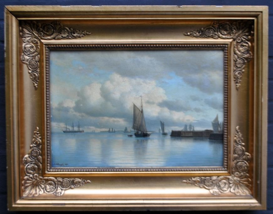 Baagøe, Carl Emil (1829 - 1902) Danmark: Drivkvaserne Snekkersteen og Egebæksvand udfor Snekkersten Havn med Hven i baggrunden. Olie på lærred. Signeret 1891. 37 x 54 cm.