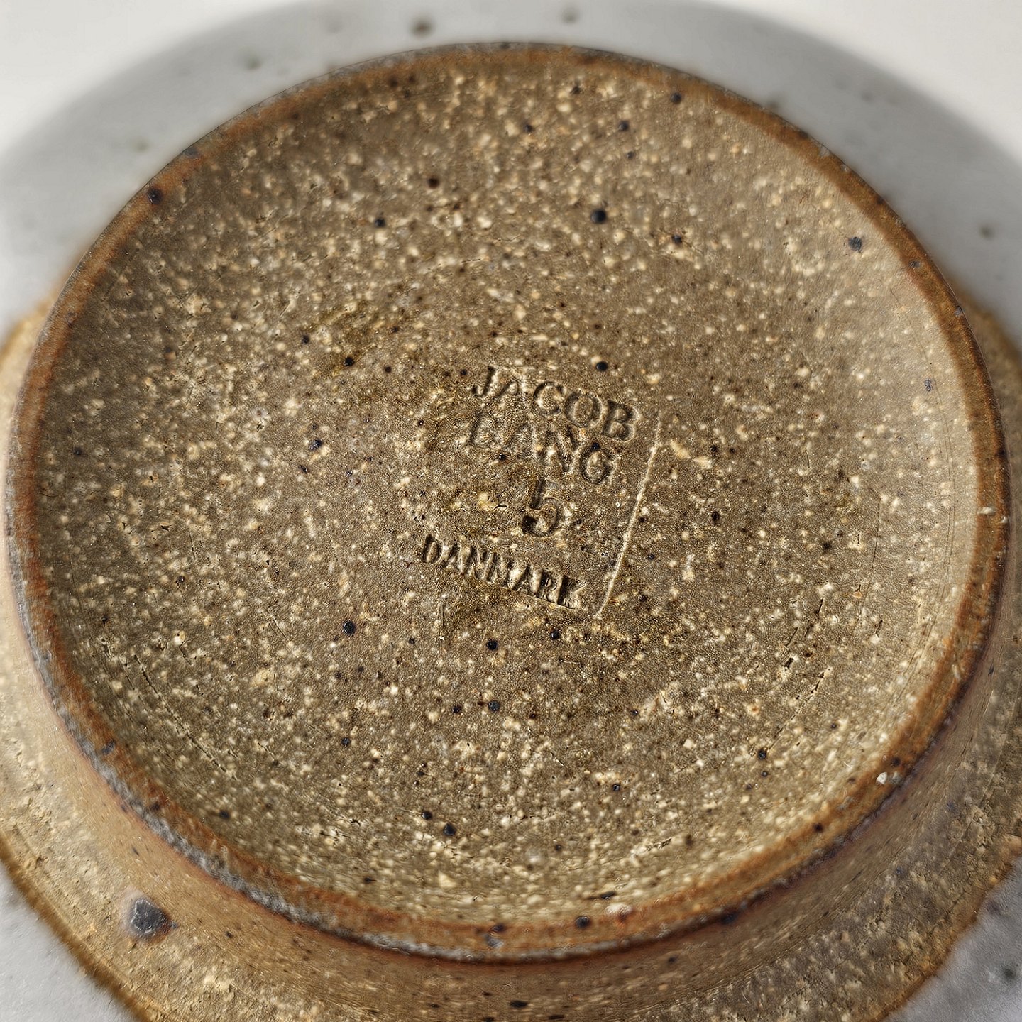 Skål i glaseret stentøj i hvide nuancer med dekoration af blå striber og en blå hvirvel i bunden