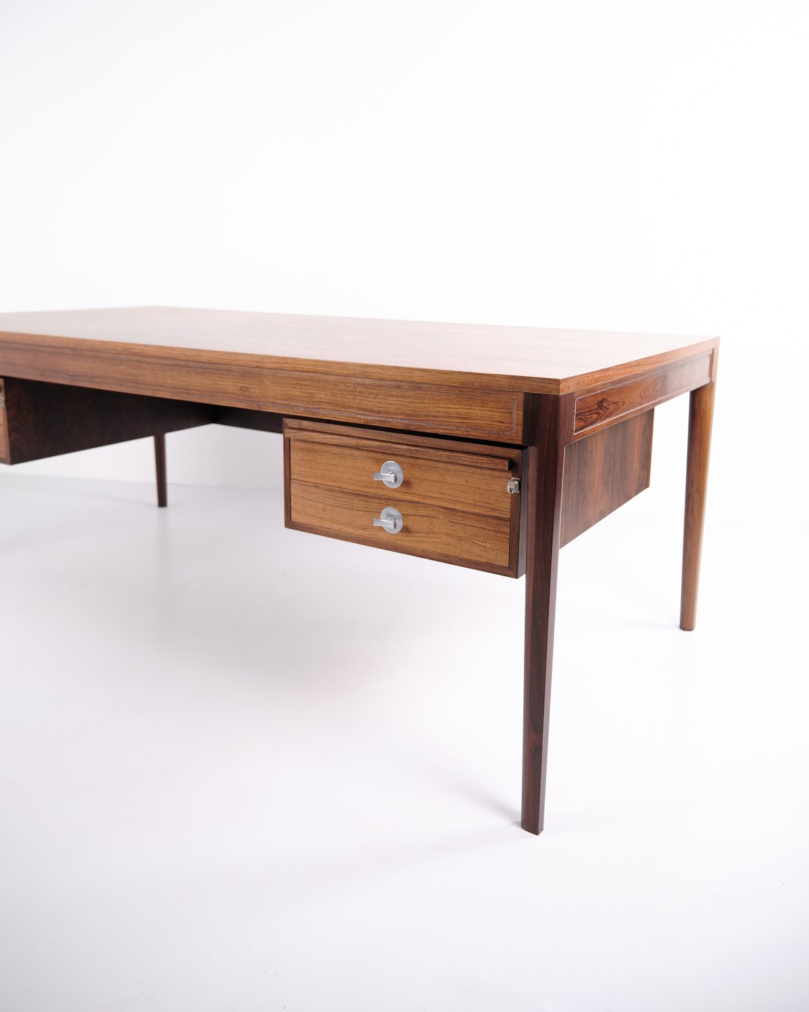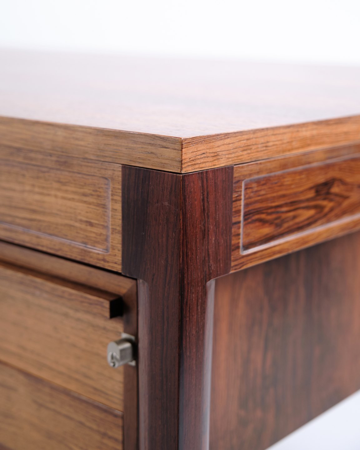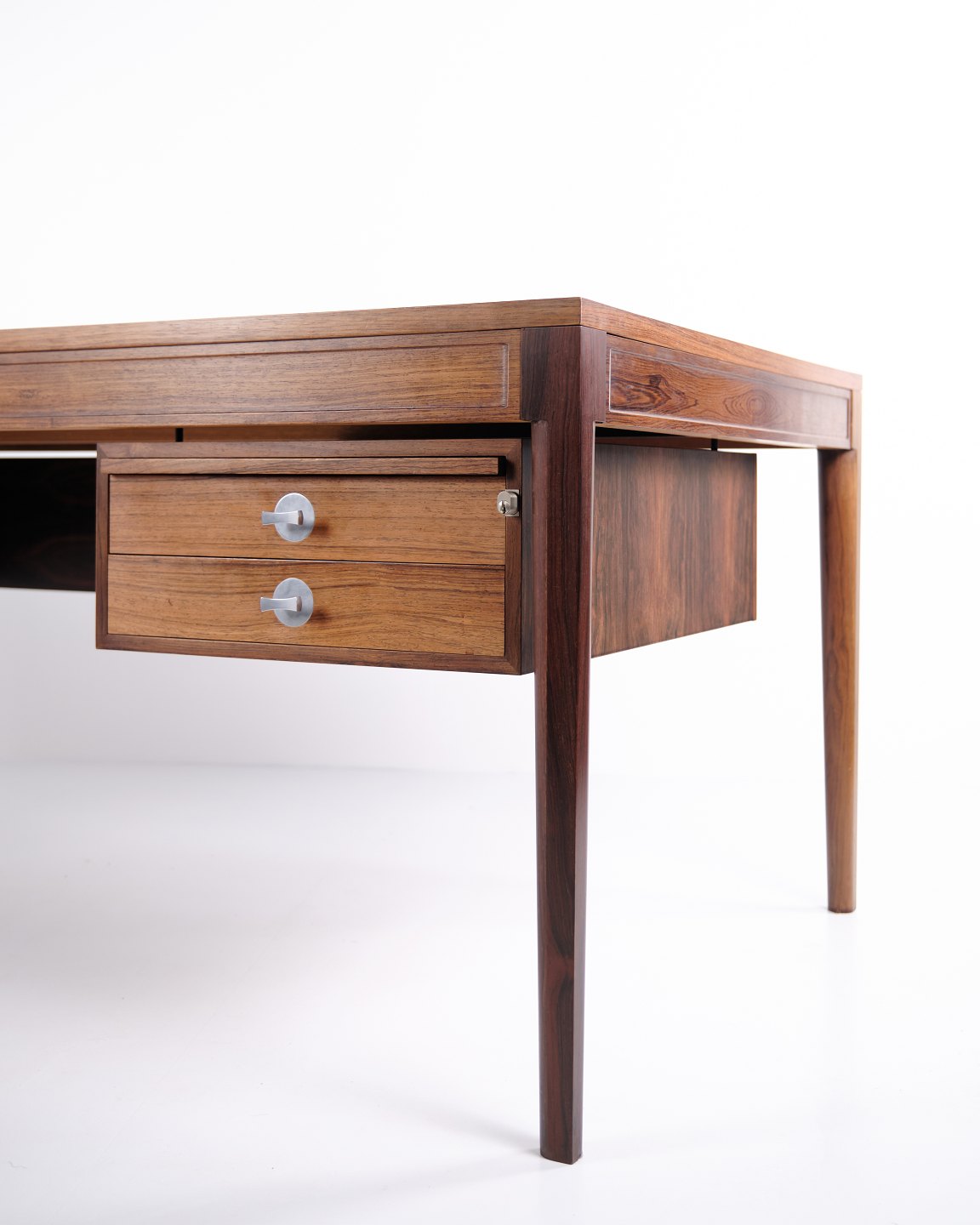 Diplomat skrivebord designet af Finn Juhl for France & Søn omkring 1961. Udført i palisander med rektangulær bordplade og to svævende skuffemoduler. Hvert modul rummer en udtræksskriveplade og to skuffer, alle med børstet stålgreb. Et eftertragtet Finn Juhl design med markant formsprog og eksklusive materialer.