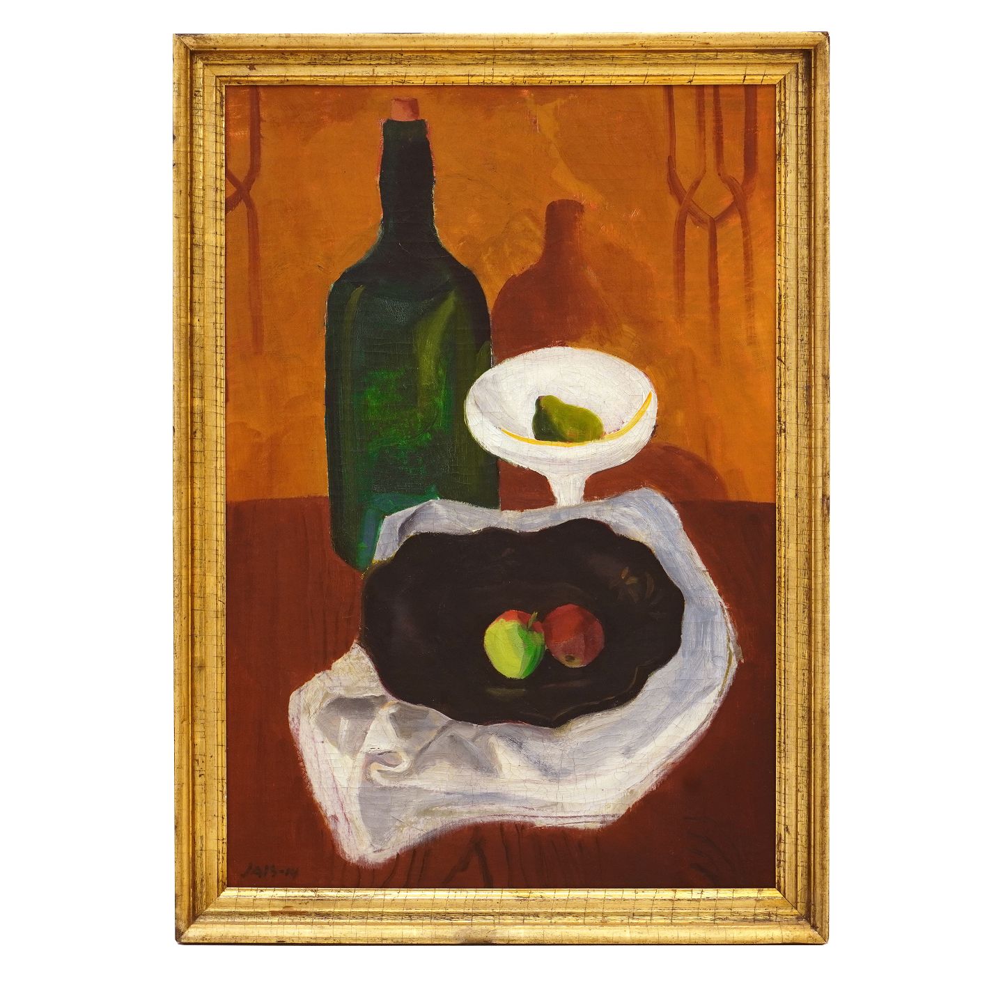 Jais Nielsen maleri. Jais Nielsen, 1885-1961, olie på lærred. Opstilling med flaske, opsats og æbler i skål. Signeret "Jais 14". Lysmål: 70x47cm. Med ramme: 79x56cm