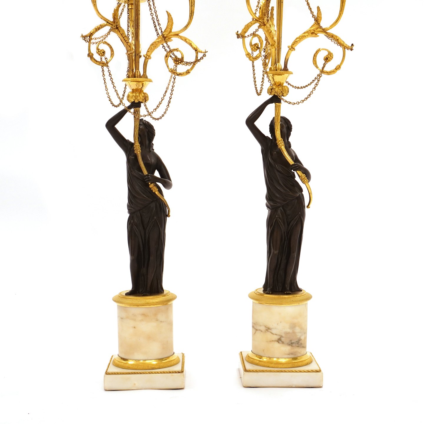 Et par store lueforgyldte og delvist sortpatinerede bronzekandelabre med marmorfod og -stamme