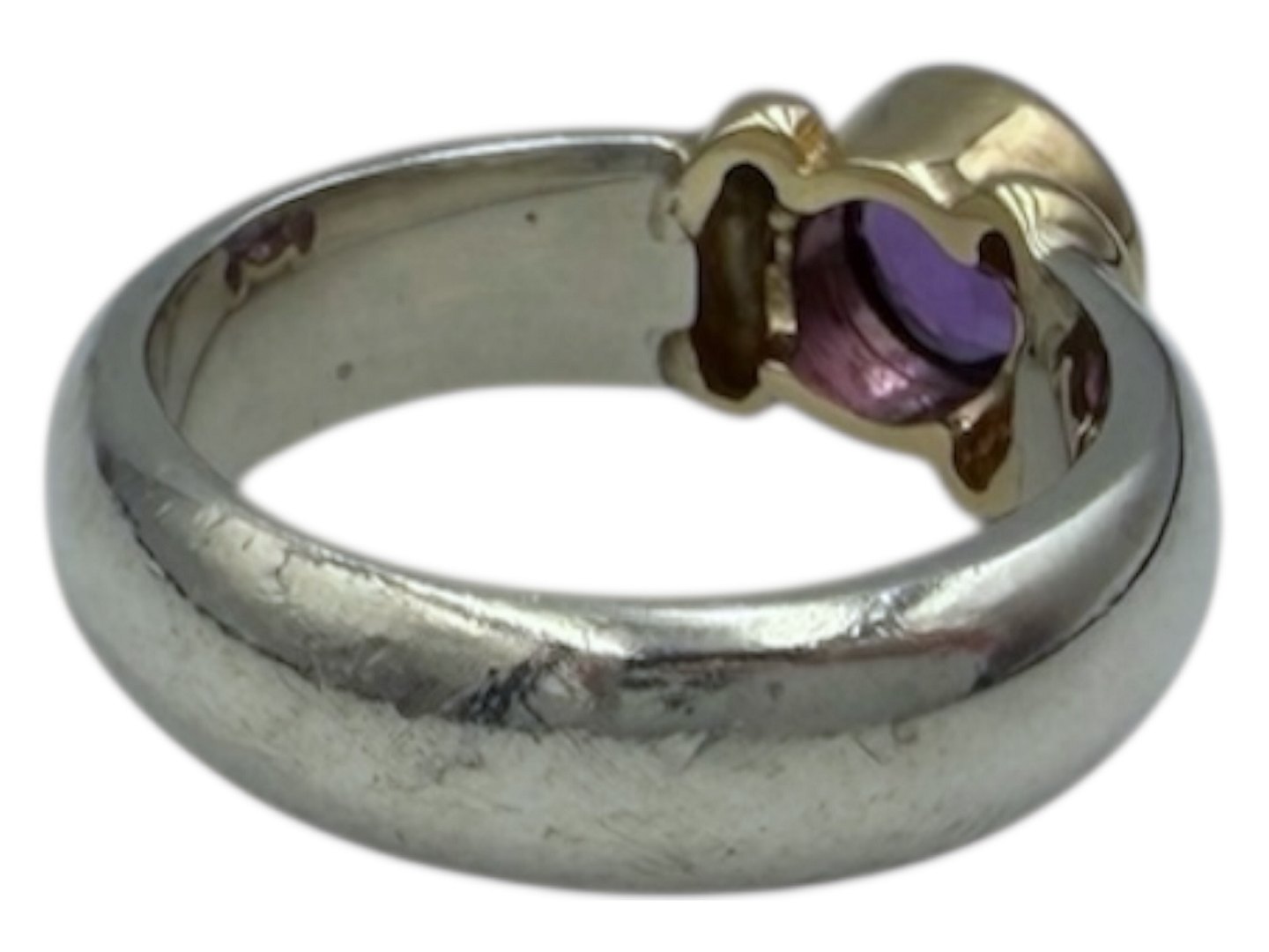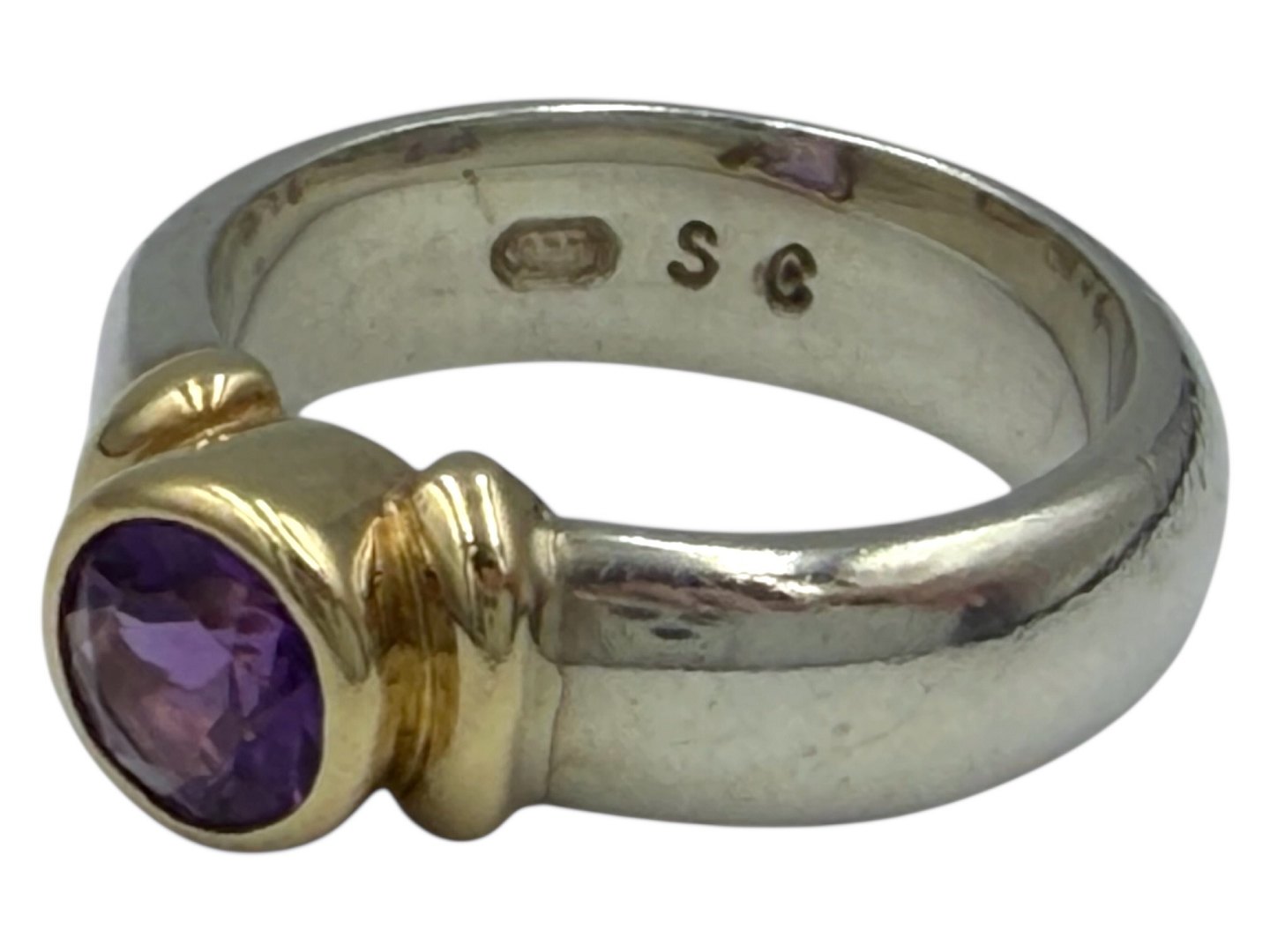 Sterlingsølv og 14 karat guld, ring med lilla sten i kraftig kvalitet.
