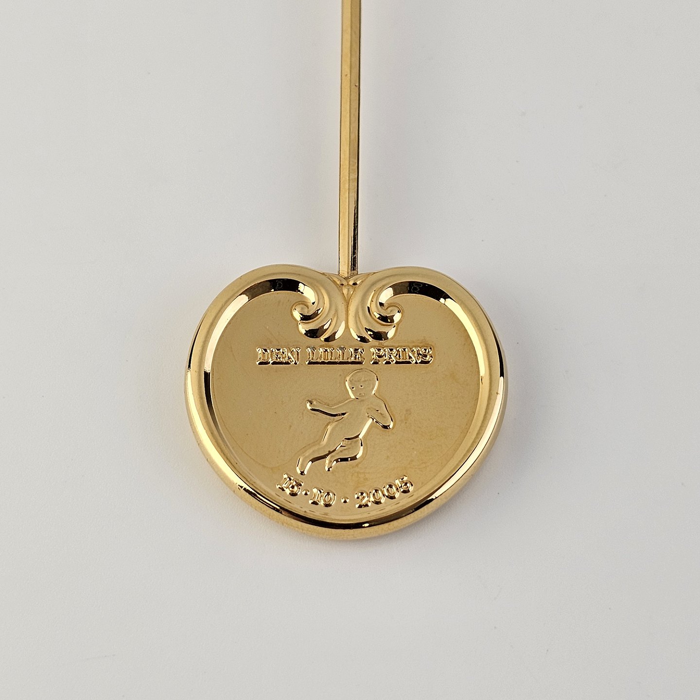 Vedhænget er et hjerte med motiv af en baby og teksten Den lille prins og 15.10.2005. Bagsiden er dekoreret med et anker og et kors