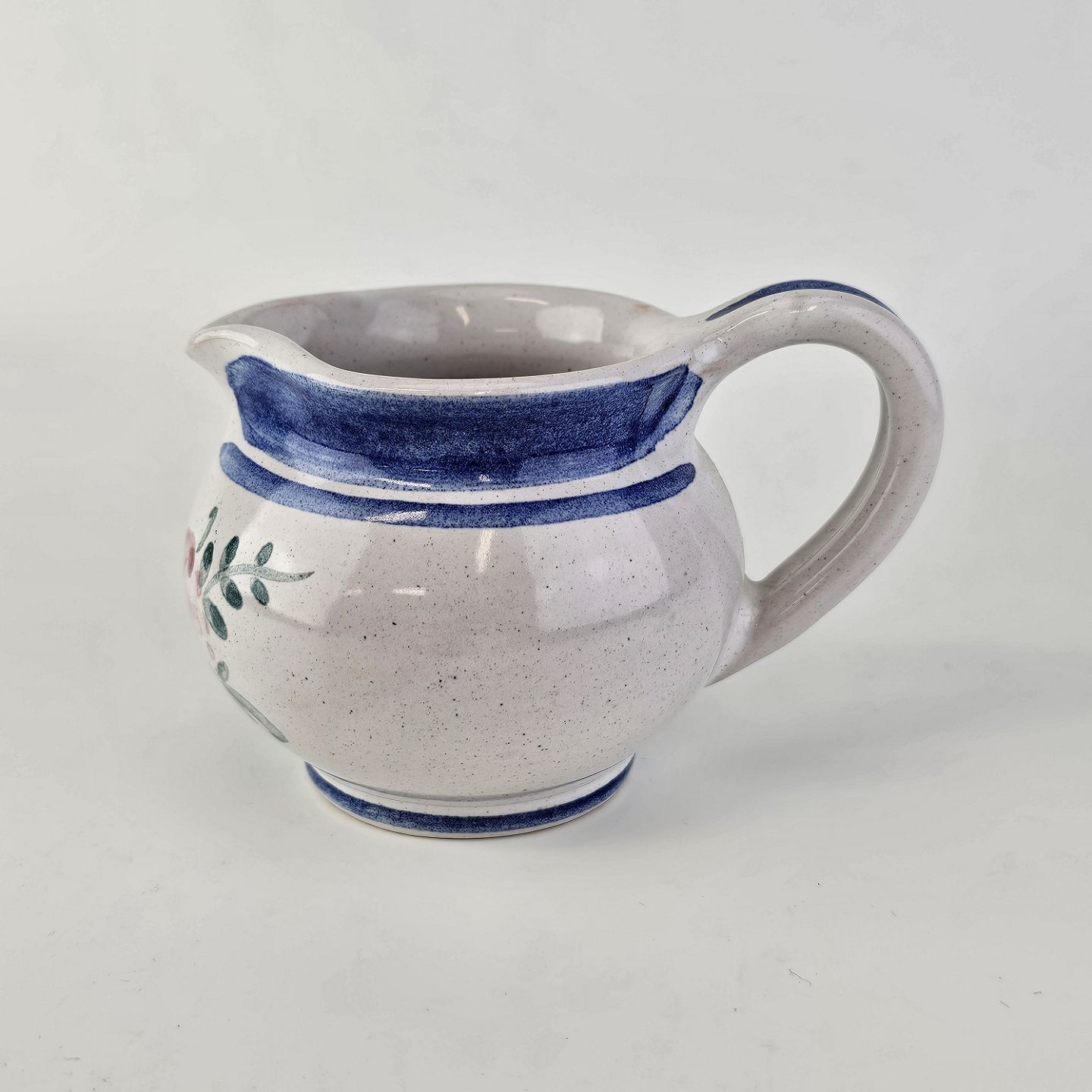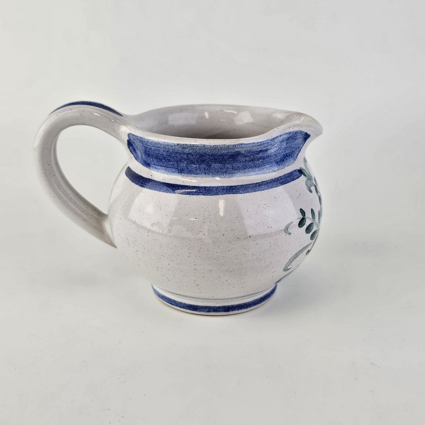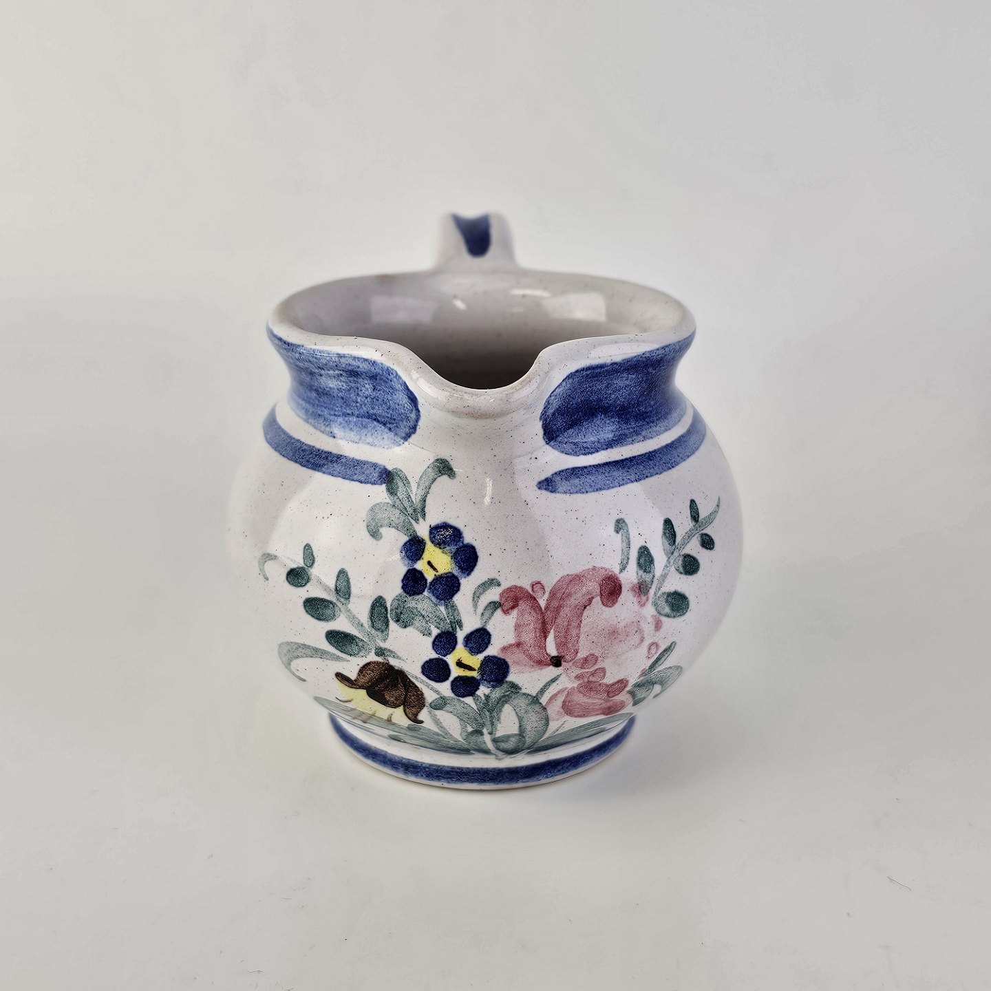Flødekande i keramik med blå detaljer og blomsterdekoration