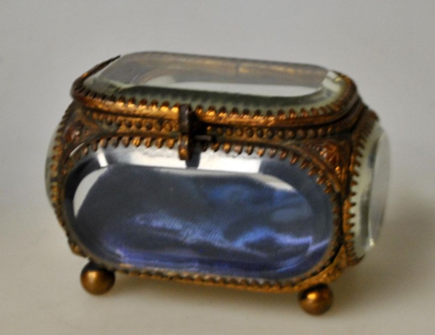 Smykkeskrin ca. 1900. Frankrig. Med facetteret glas og dekoreret messing rammer og fire ben. 6,5 x 5,5 x 8 cm.