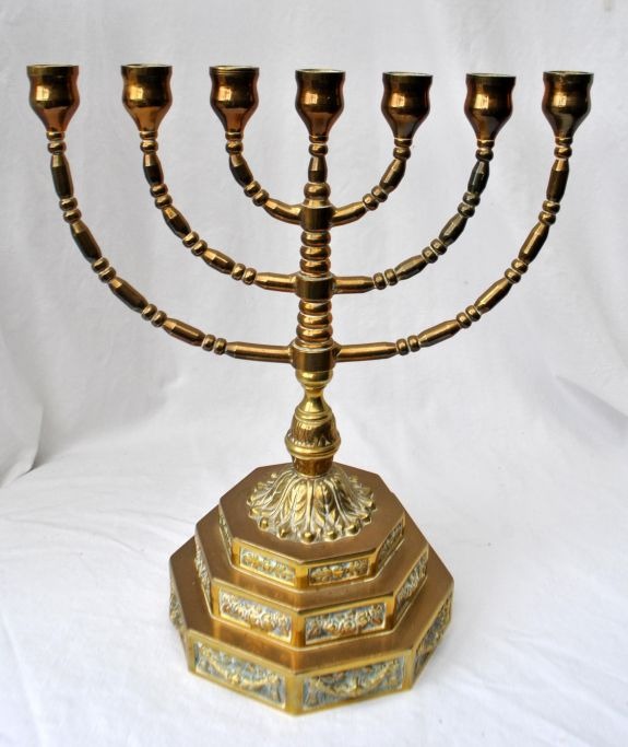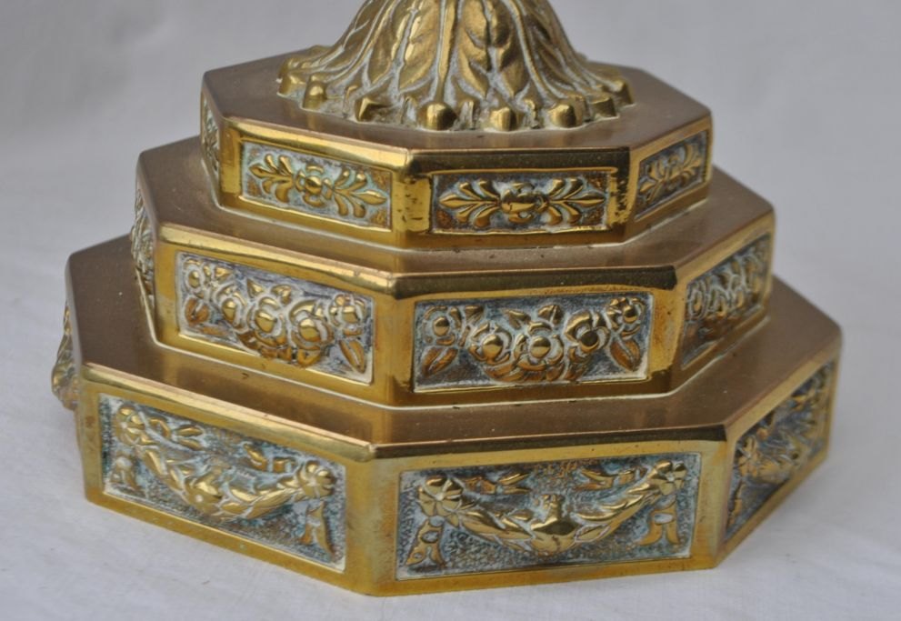 7 armet stage i messing/bronze, ca.1900. Med ottekantet fod med dekorationer i form af guirlander. Profileret stamme. Stagen indebærer symbolik både i gammel- og nytestamentelig betydning. H: 31 cm.