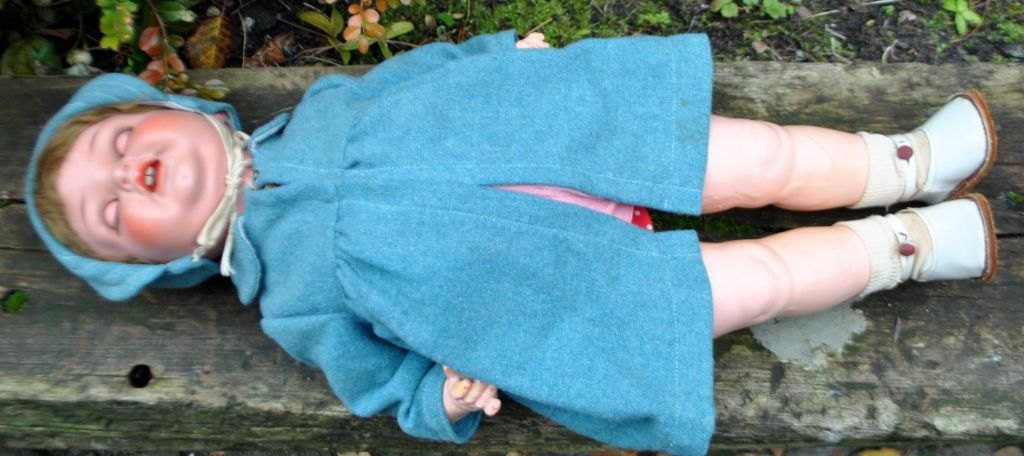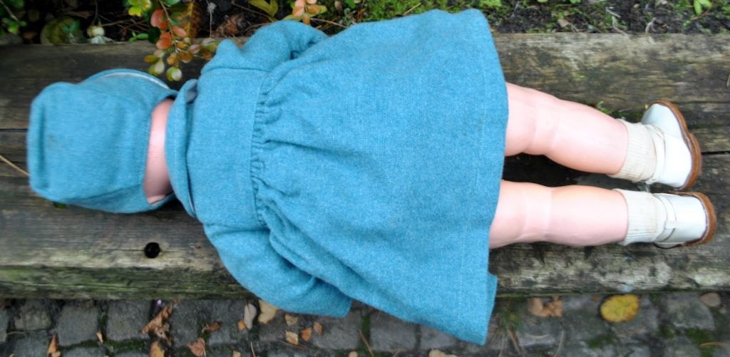 Stor Heubach - Köppelsdorf dukke 342.4 1/2, 20. årh. Tyskland. Stemplet. Hoved og krop af komposit materiale. Blå øjne, der kan åbne og lukke, med vipper af hår. Tøj i uld og sko i patent og lædersål. L: 60 cm.
