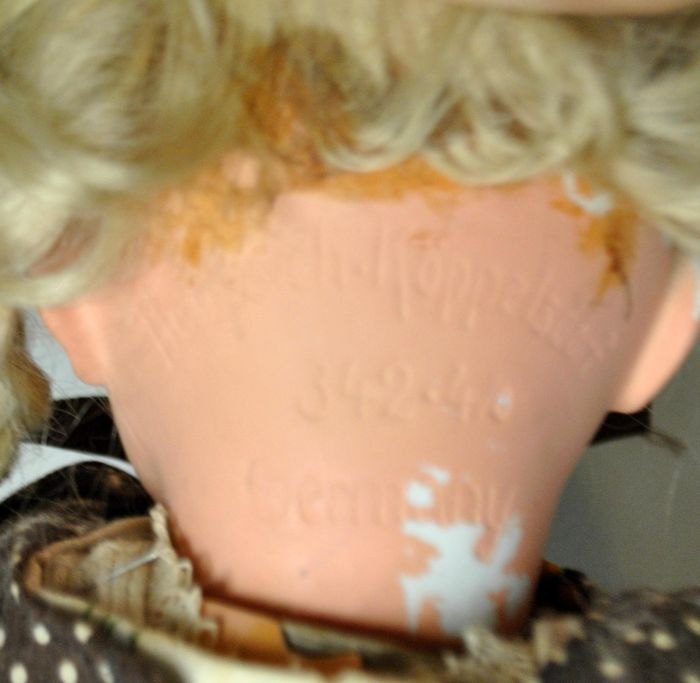 Heubach - Köppelsdorf dukke no. 342.4/0, 19. årh. Tyskland. Stemplet. Hoved og krop af porcelæn. Blå øjne, der kan åbne og lukke med vipper af hår. Tøj af bomuld. L: 42 cm.