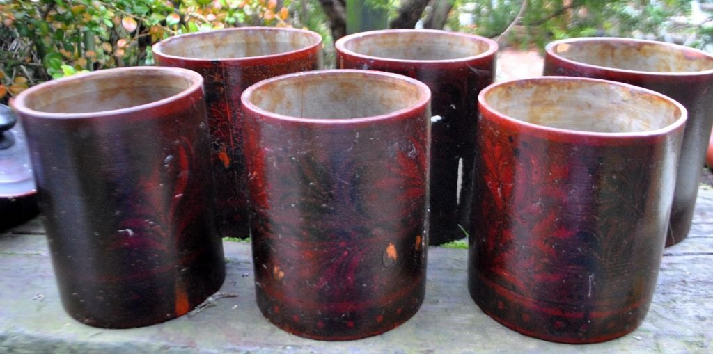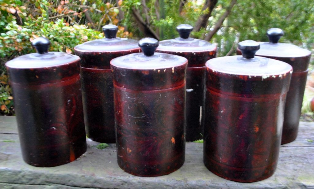 Samling russiske trædåser, 19. årh. Drejet og udhulet tre. Med udvendige bemalinger. Lakeret. Indvendig med sølvfarve. I alt 6 stk.