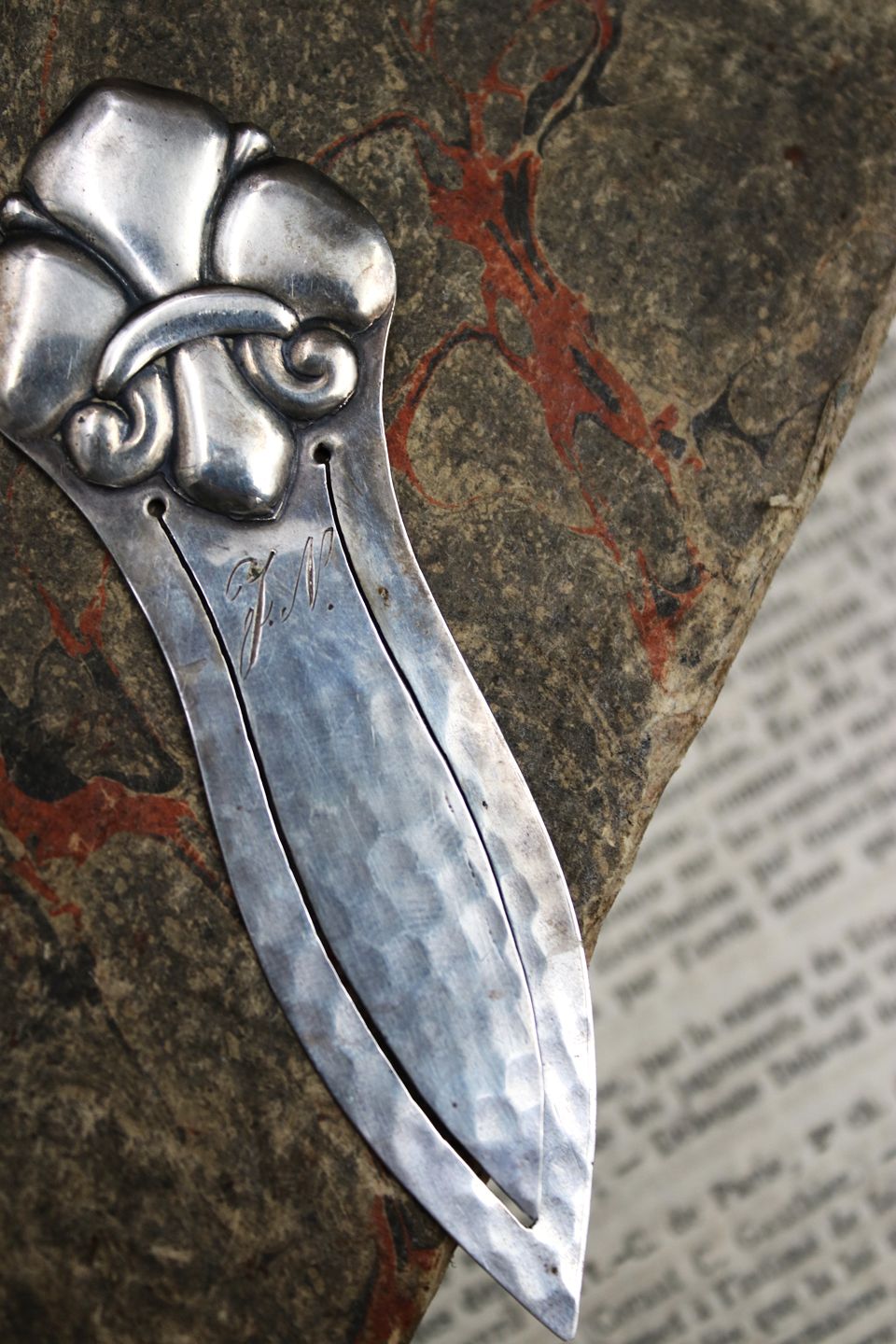 Gammelt bogmærke i sølv , stemplet 830s (initialer JN)