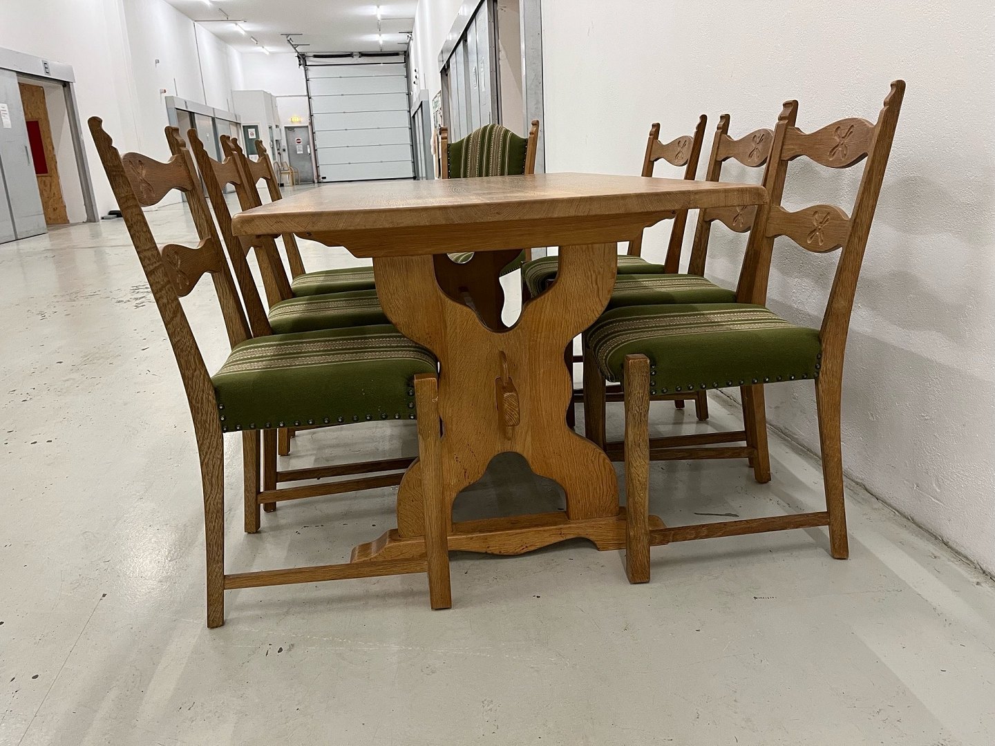Dette elegante spisebordssæt i massiv eg er designet af Henry/Henning Kjærnulf og fremstår som et smukt eksempel på dansk møbeldesign fra 1960’erne. Sættet har haft samme ejer siden 1967 og er bevaret i særdeles flot stand med kun få, naturlige brugsspor ingen dyr eller røg.