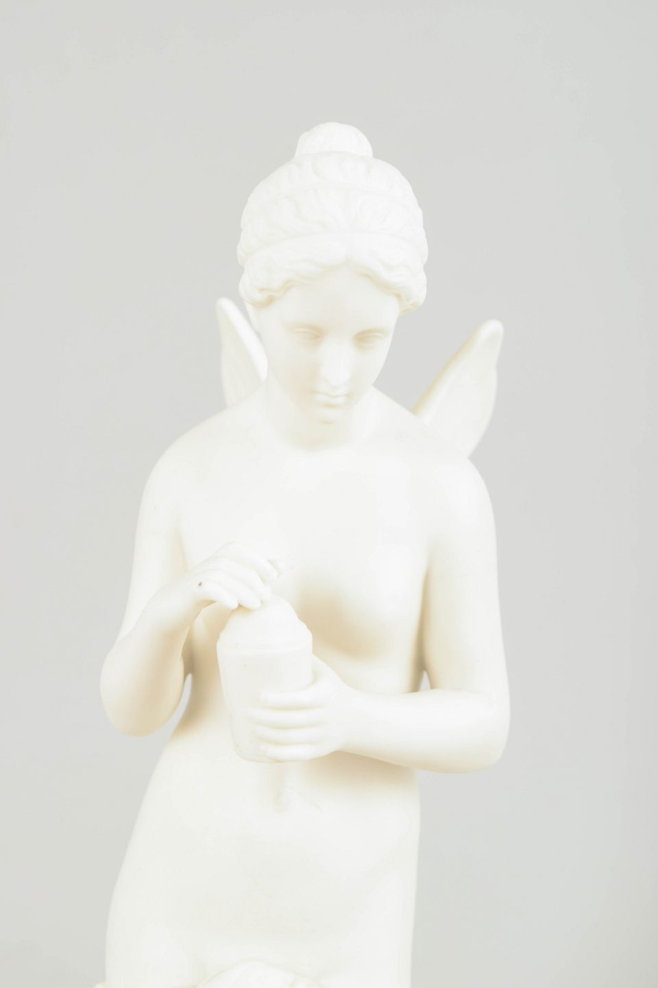 Biscuitporcelænsskulptur forestillende Psyche, den mytologiske ånd og sjælens gudinde. Figuren er udført i uglaseret, mat porcelæn med klassicistisk formsprog, fine anatomiske detaljer og blødt modelleret draperi. Psyche er afbildet stående med vinger og et lille kar i hænderne. Produceret hos Gustavsberg omkring år 1900.