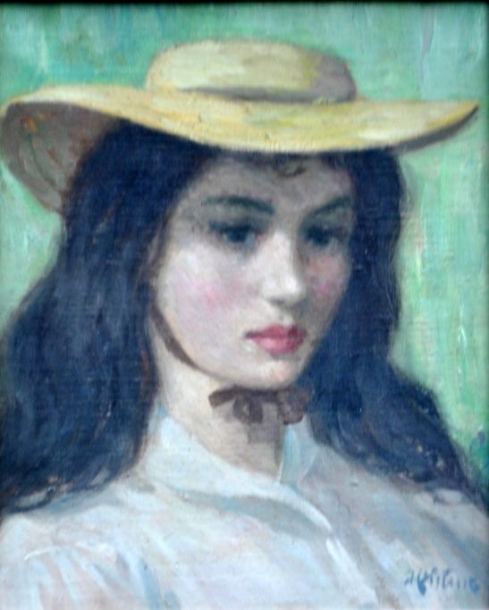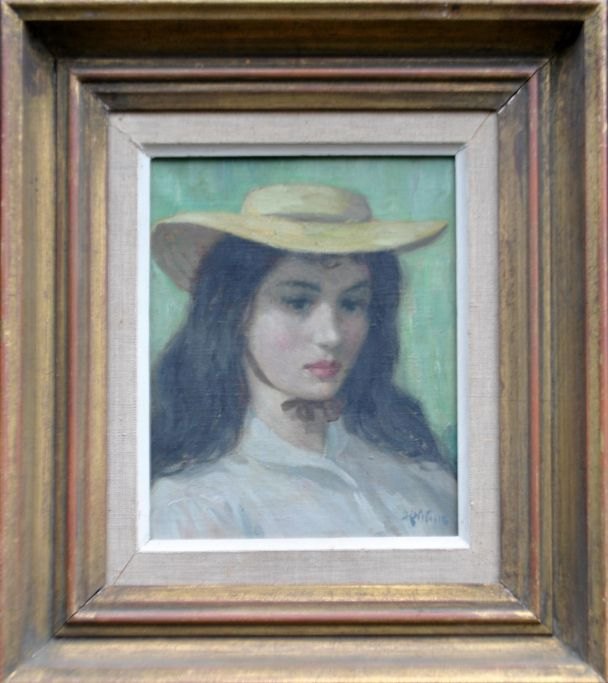 Helme, Helge (1894 - 1987) Danmark: Ung kvinde med hat. Olie på lærred. Signeret: H. Helme. H: 27,5 cm. B: 22 cm.