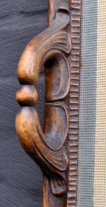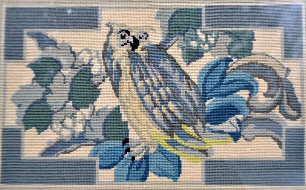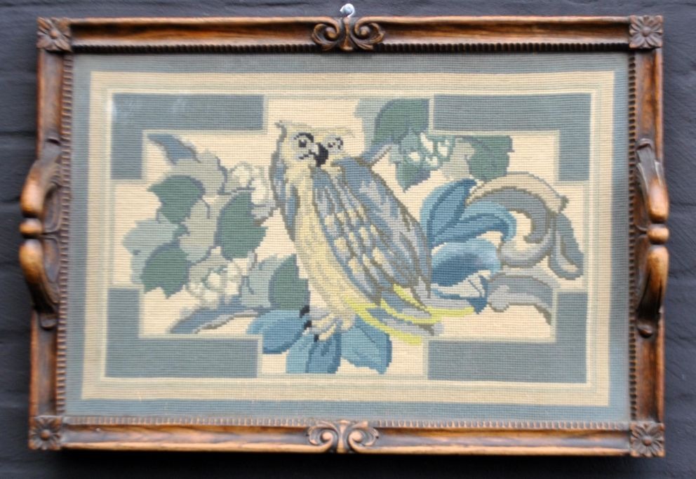 Bakke med broderi, 19. årh. Bakke i udskåret egetræ med to håndtag. Med glasplade, hvorunder broderi af ugle mellem bladværk. 65 x 44 cm.