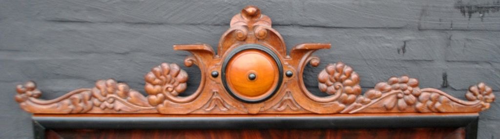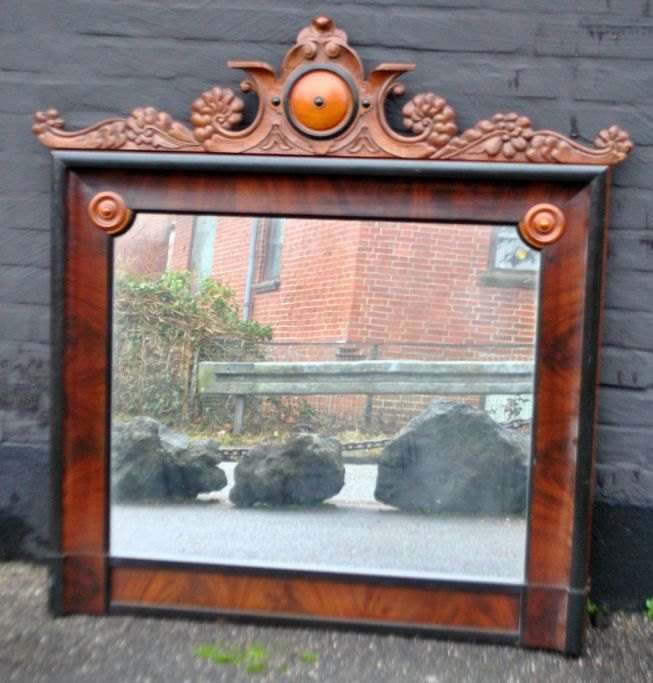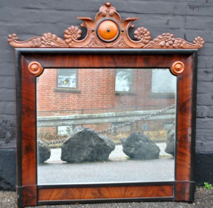 Spejl, 19. årh. Mahogni ramme med udskæringer. H: 108 cm. B: 103 cm.