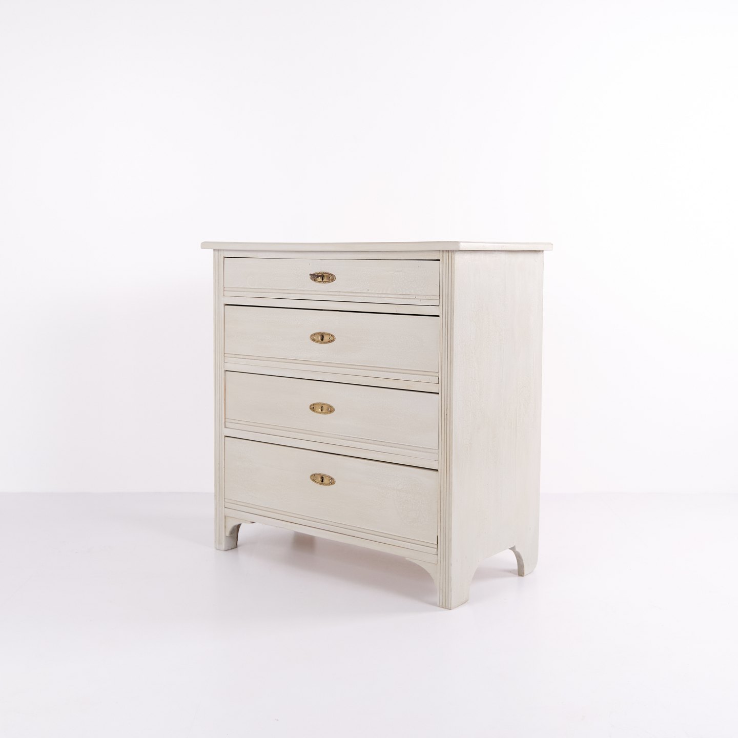 Antik kommode fra 1890’erne med fire skuffer. Gråmalet træ og klassisk formsprog med smuk patina.