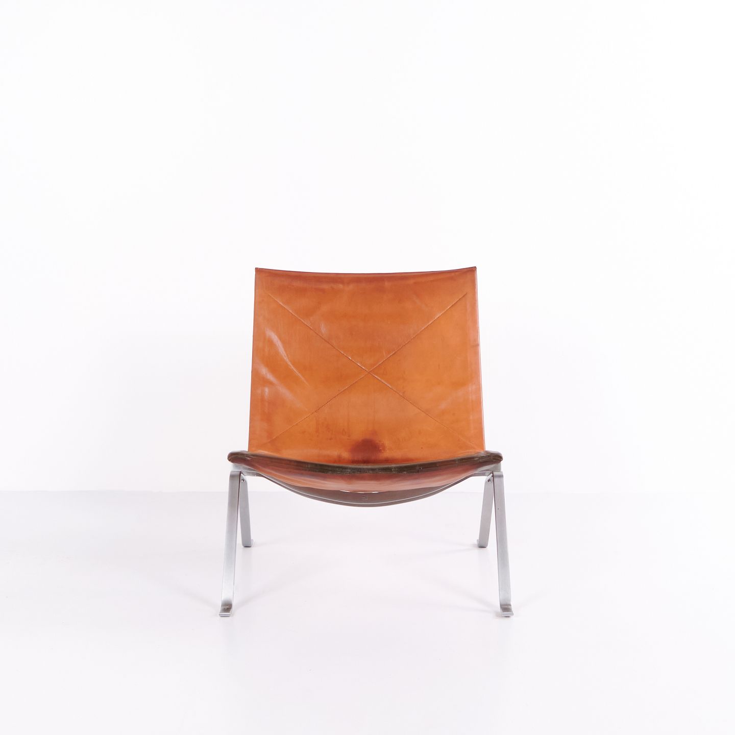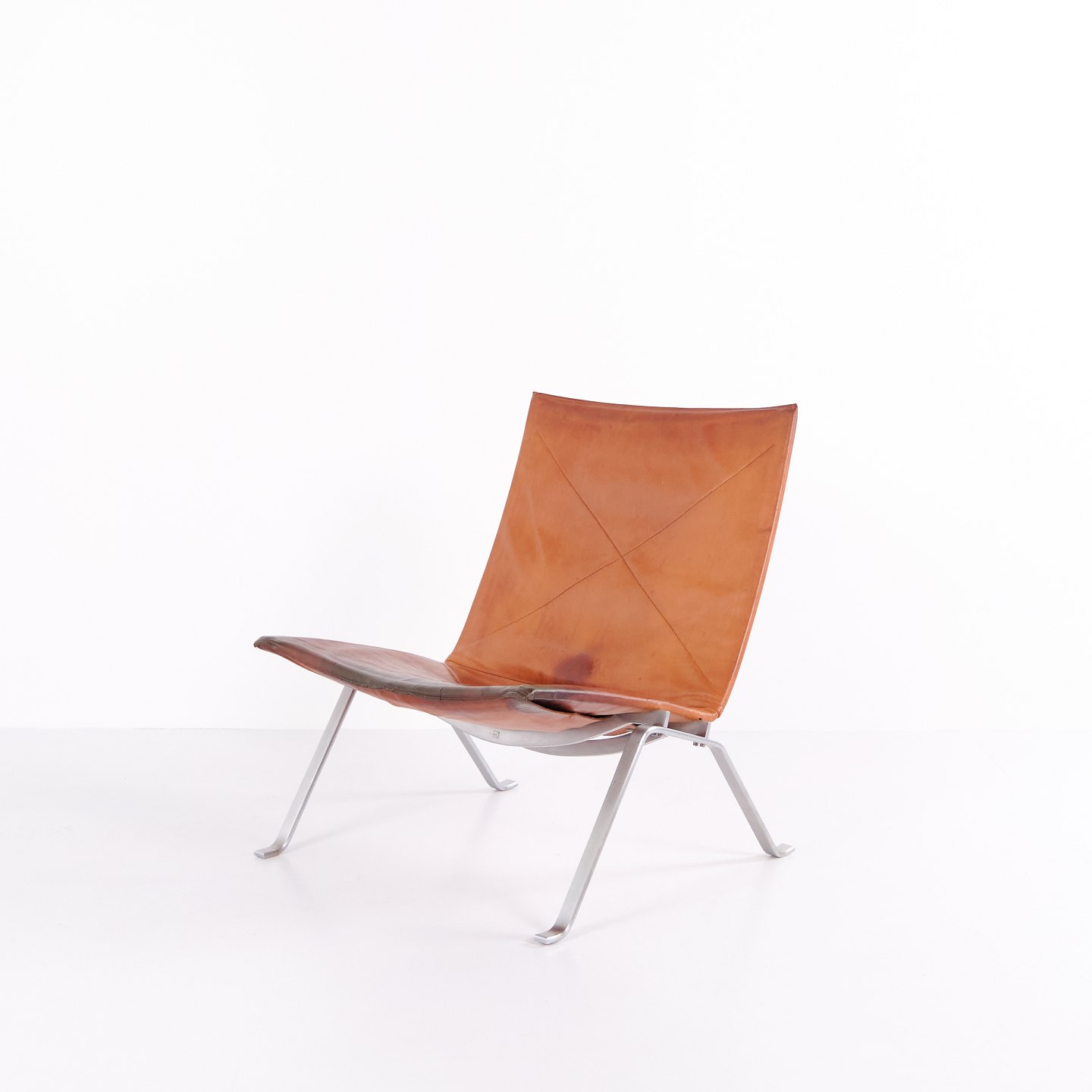 PK22 lænestol af Poul Kjærholm for E. Kold Christensen. Original polstring i patineret cognac læder. Dansk designikon fra 1950’erne.