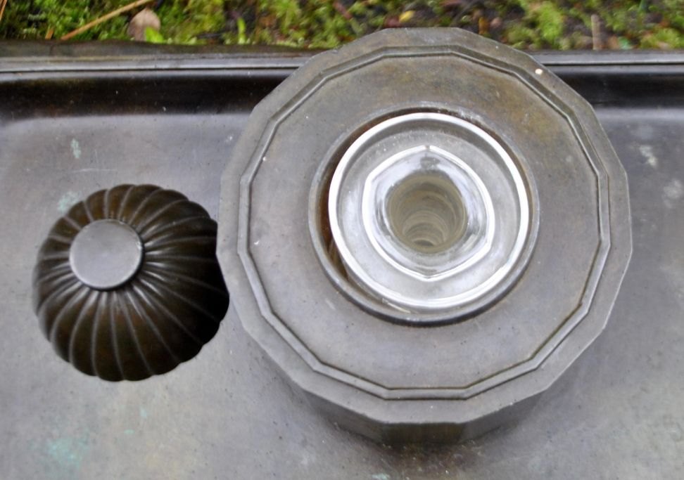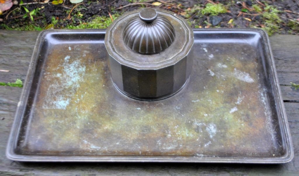 Teller mit Tintenfass im Art-déco-Stil. Im Tintenfass befindet sich ein Tintenfass mit Deckel (defekt).