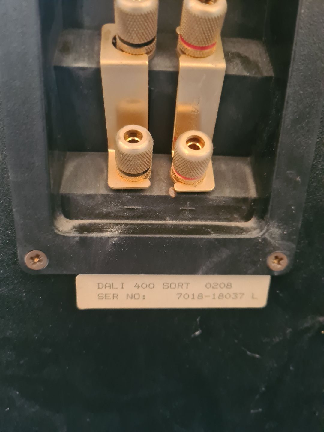 Højtalerpar fra DALI model 400. Testet og lyder fint. Fremstår dog med lidt skrammer på kabinetterne. (Billede)
