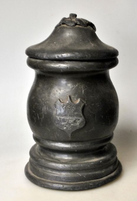 Barok tin tobaksbeholder, 18. årh. Med våbenskjold på siden. Indvendig med vægt. Låg med bladværk. H: 18 cm.