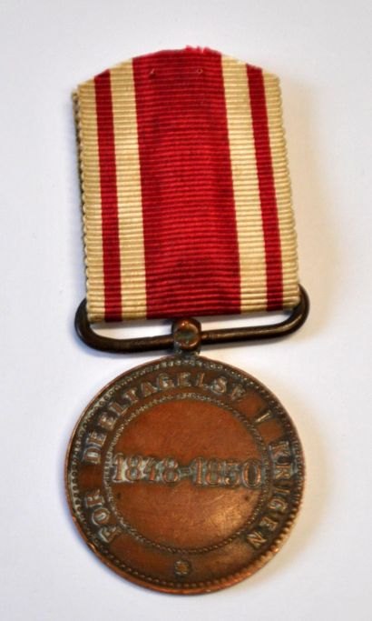 Medalje for deltagelse i krigen 1848 - 1850. Kobber. Med teksten: For deltagelse i Krigen 1848 - 1850. Med Frederik VII's profil. Medalliør: Alphee Dubois. Båndlængde: 4 cm. Dia. medalje: 3 cm.