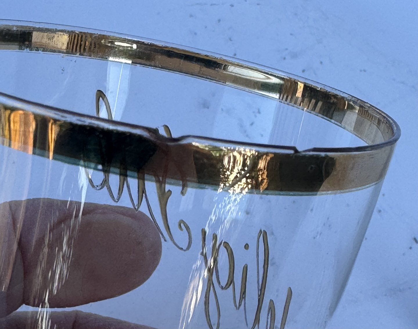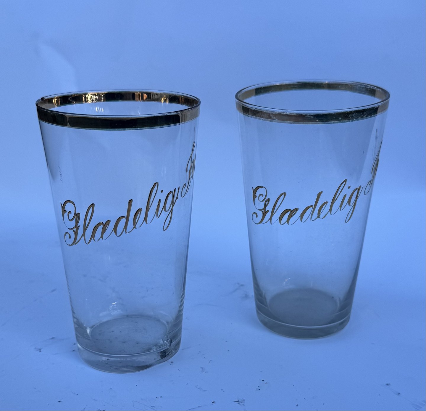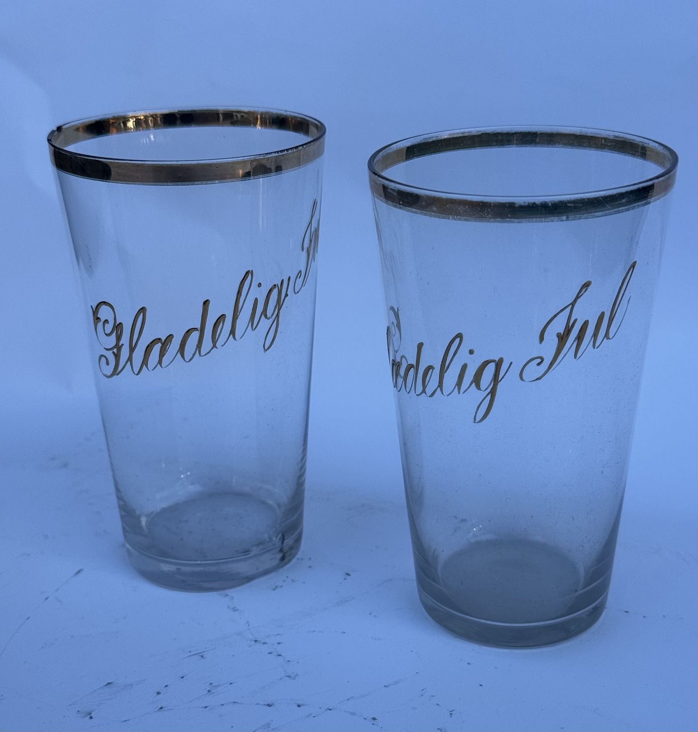 Par vandglas fra Fyens Glasværk ca. 1920. Begge med emaljeret tekst “Glædelig Jul”. Det ene glas har to små skår på den guldbelagte kant (se foto). H. 12,4 cm