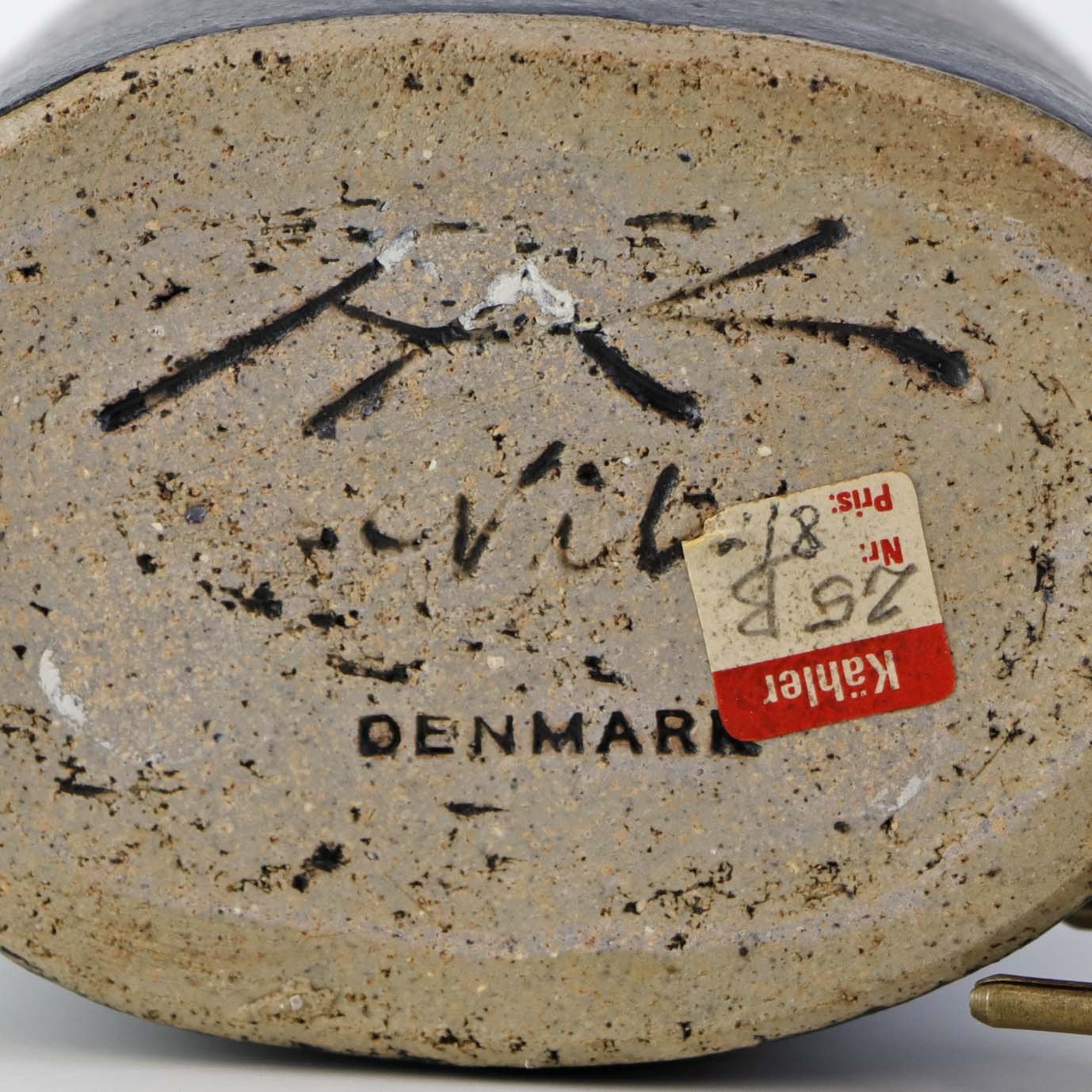 Oval lampefod i keramik med brun og blåsort glasering og lys plastfatning.