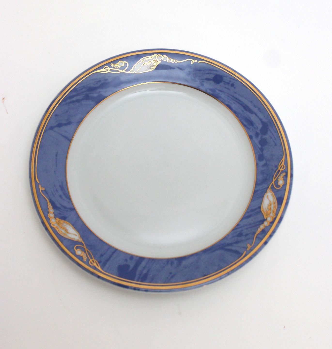 Royal Copenhagen, Blå Magnolia. Blå marmoreret bort dekoreret med gylden blomsterknop. Designet af Flemming Eskildsen. Stor kagetallerken. Diameter 17 cm. Nr. 617. I. sortering. Pris: 50 kr. stk. Lager: 6