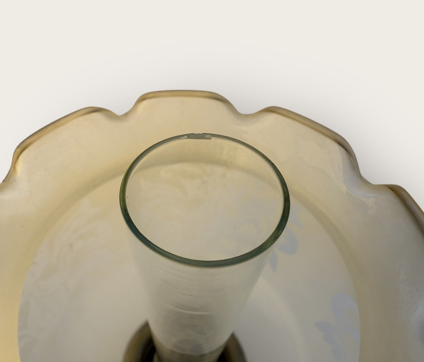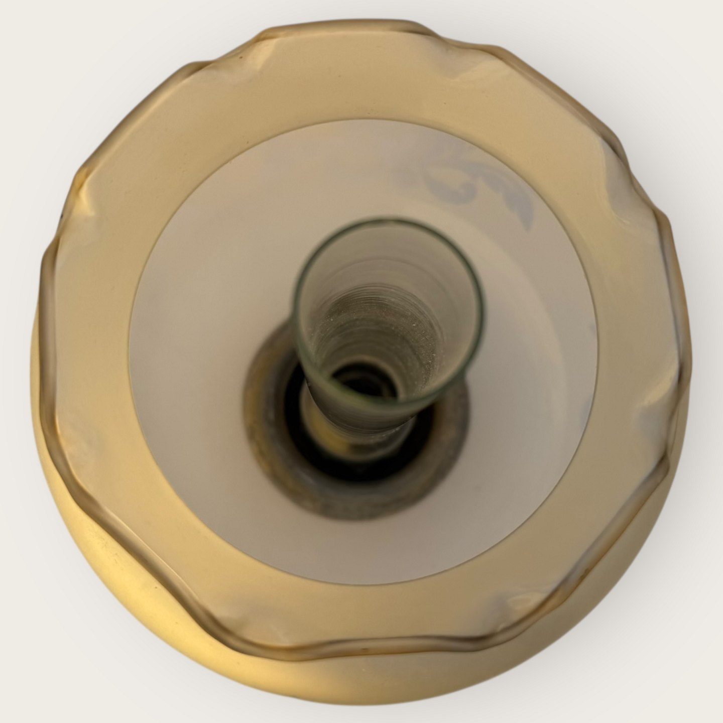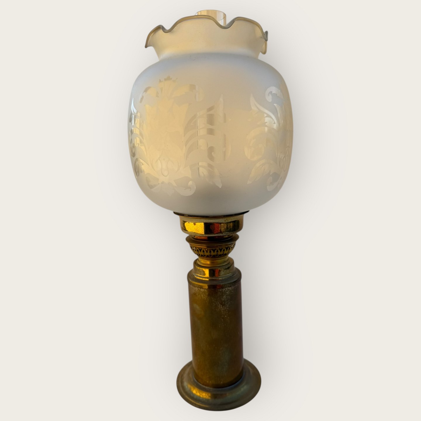 Cawa petroleumslampe, messing med glasskærm, højde 31cm, meget lille hak i brændeglasset øverst (se foto) *Ellers pæn patineret stand*