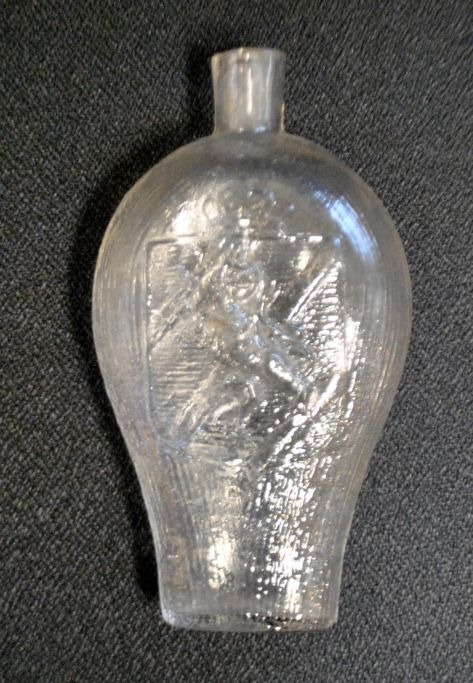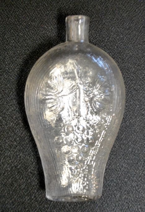 Svensk lommelærke med riller, 19. årh. Klar glas. Med svensk våbenskjold og motiv af vinklase. L: 14,5 cm.