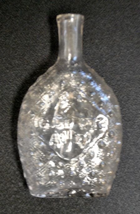 Tysk lommelærke med motiv af minearbejder, 19. årh. Klart glas. Nubret glas. Præget med teksten "Glück Auf!" L: 15,5 cm.