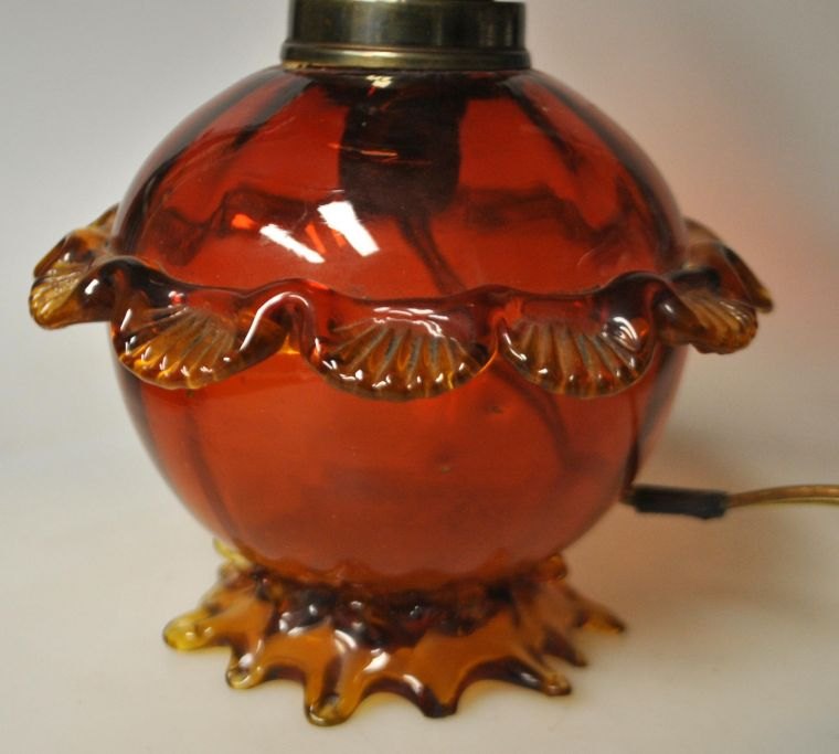 Petroleumslampe i rødt glas med gule kanter, ca. 1900, Danmark. Omgjort til el. H.: 24 cm.