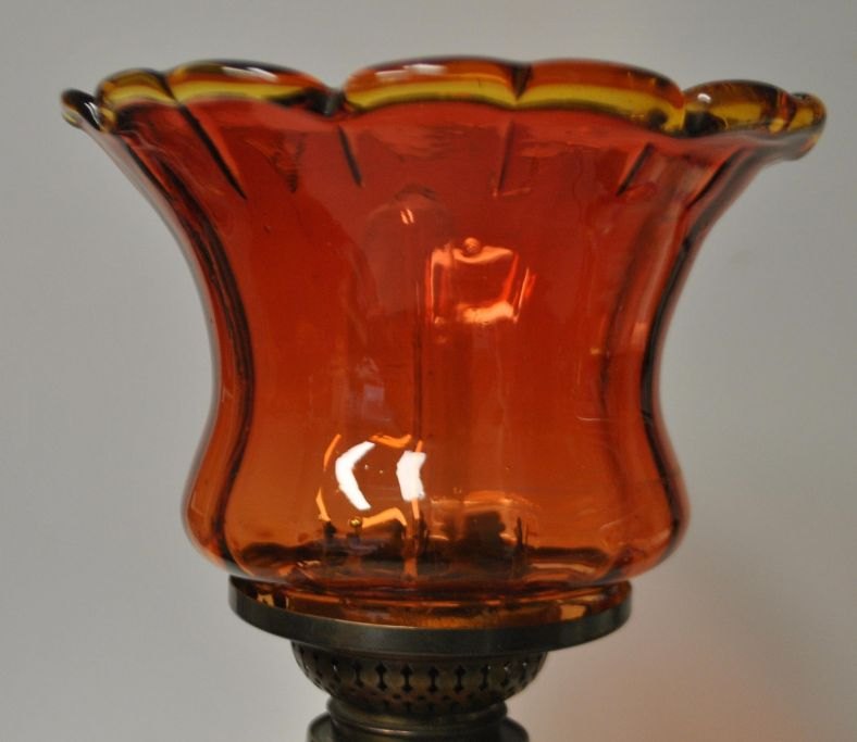 Petroleumslampe i rødt glas med gule kanter, ca. 1900, Danmark.