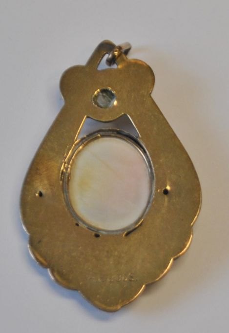 Holger Fischer (1893 - 1937) København, Danmark: Forgyldt sølv brosche. Med perle og camè med Diana i profil. Stemplet. H.: 5,5 cm.