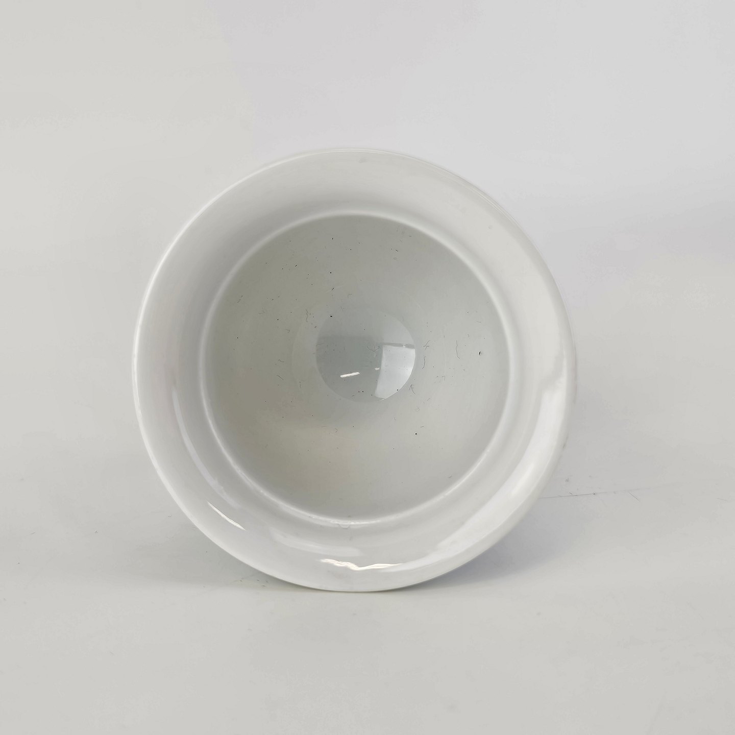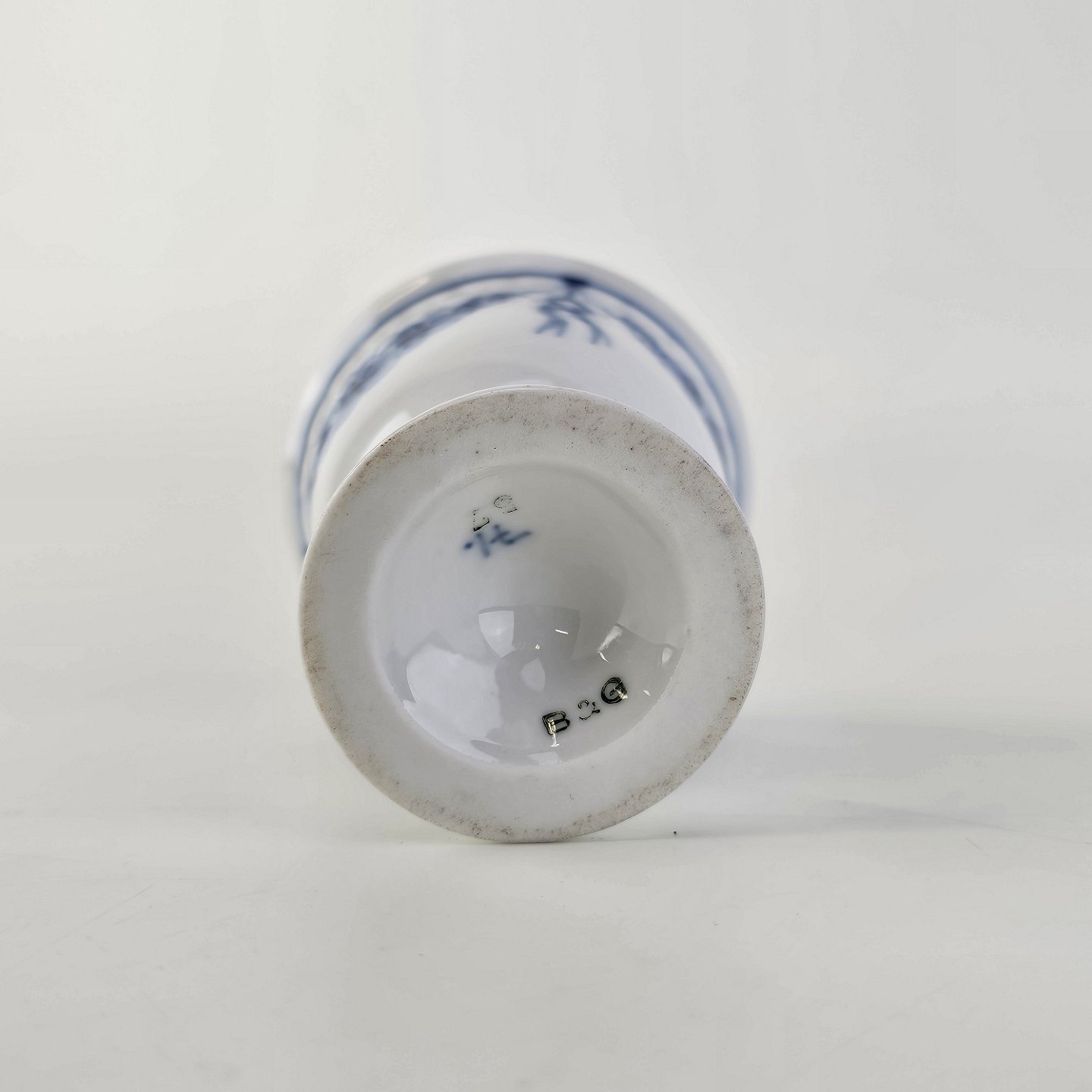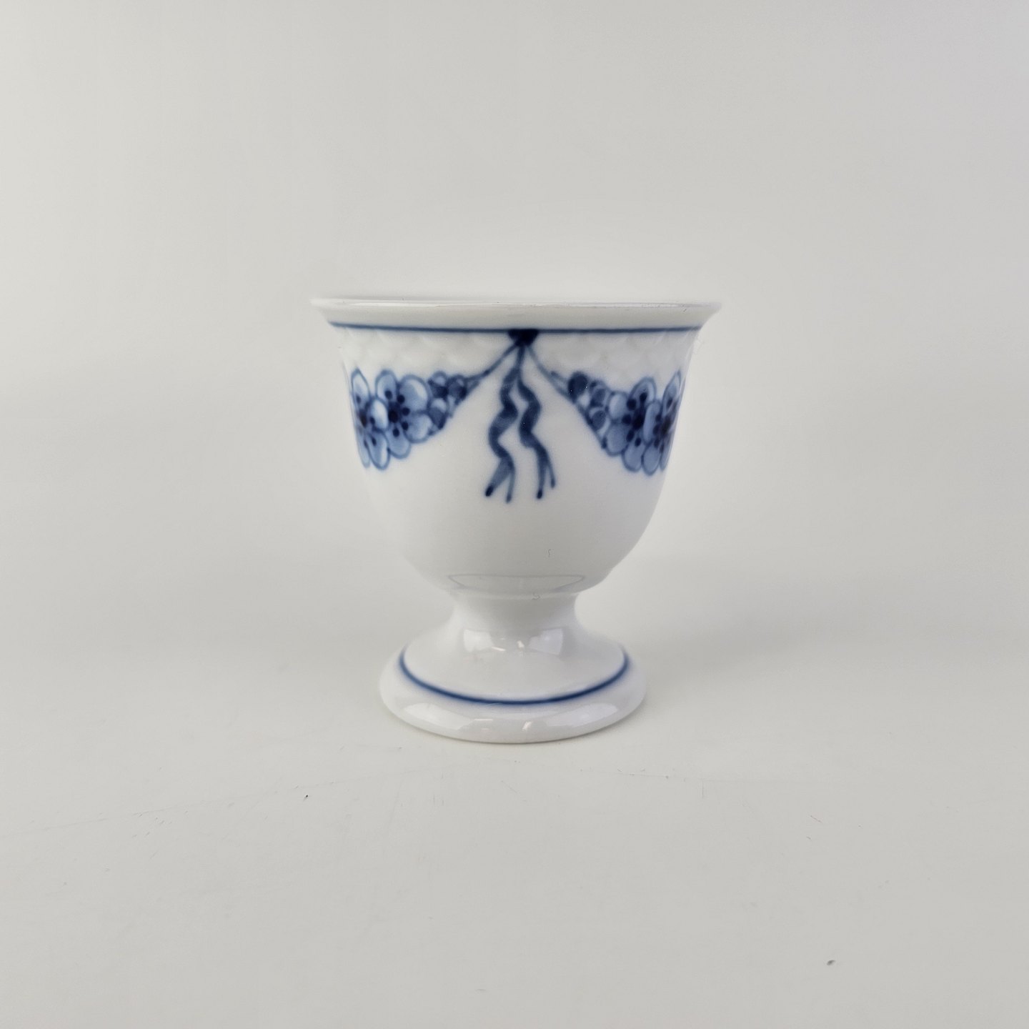 Service i hvidt porcelæn med skelform og motiv af guirlander med blå blomster
