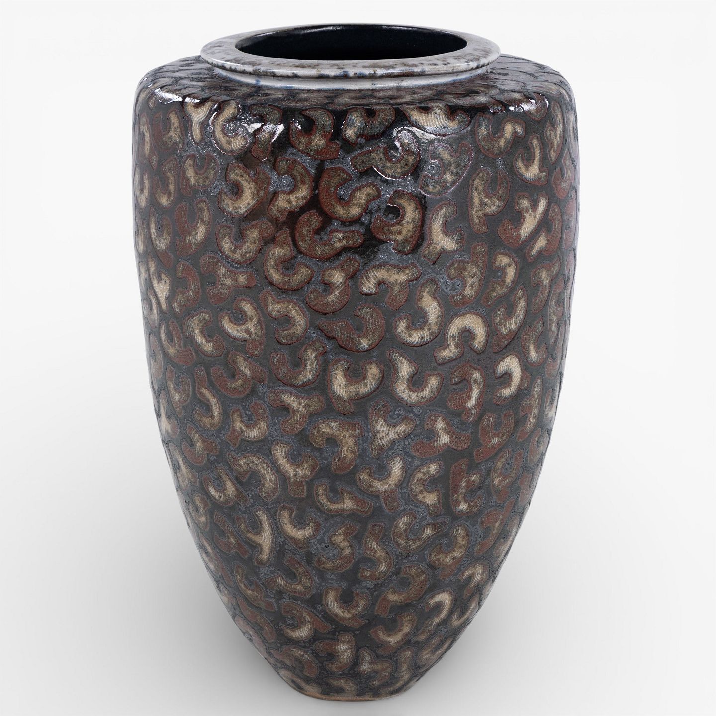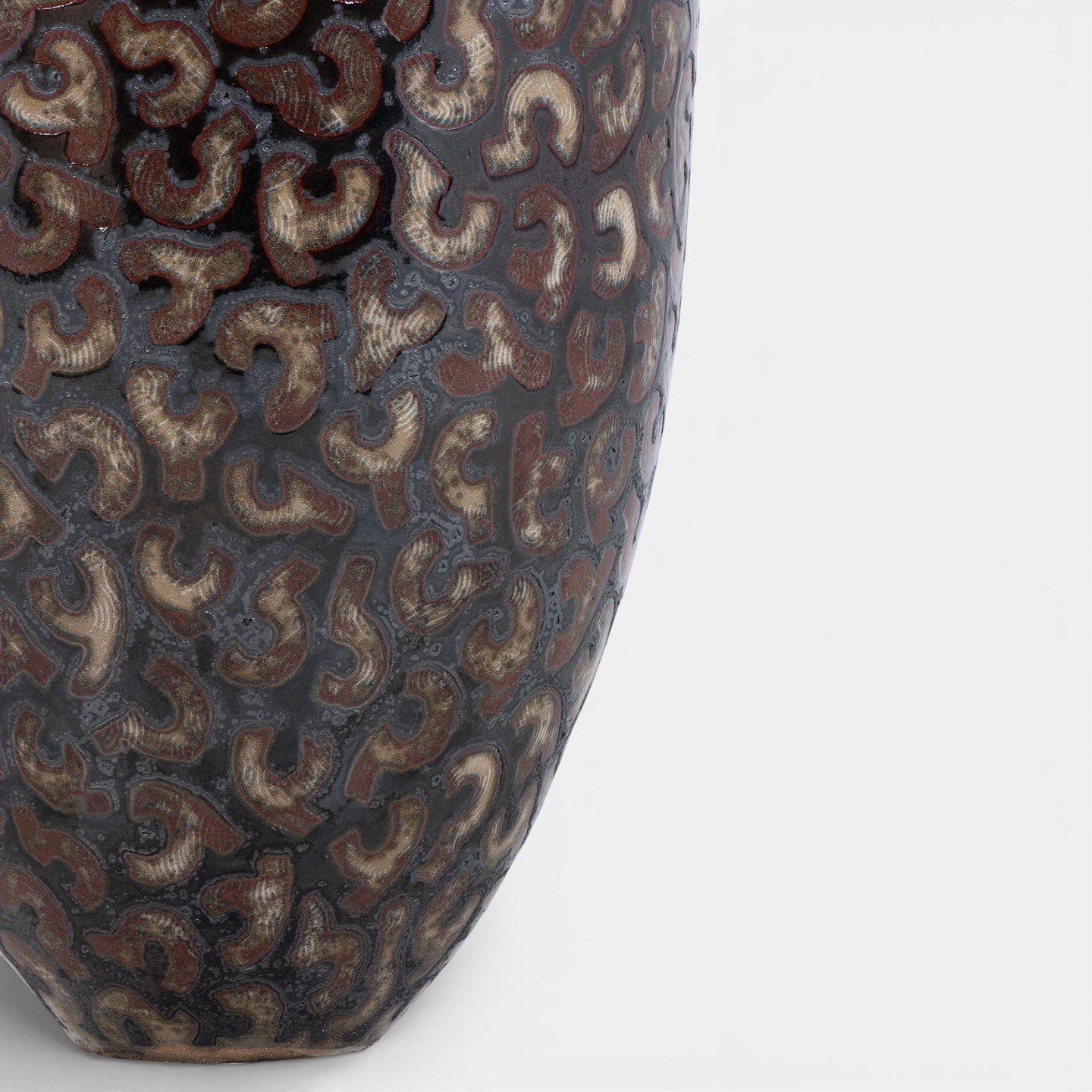 Kolossal krukke i stentøj med sort glasur og røde stafferinger. Signeret.