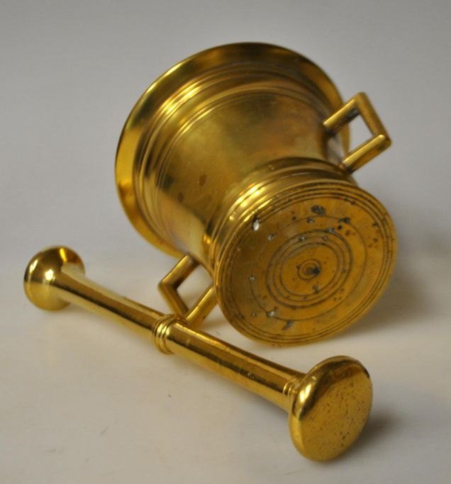 Dansk messing morter med pistil, 19. årh. Morter med to hanke. Højde.: 9 cm. Længde pistil: 17 cm.