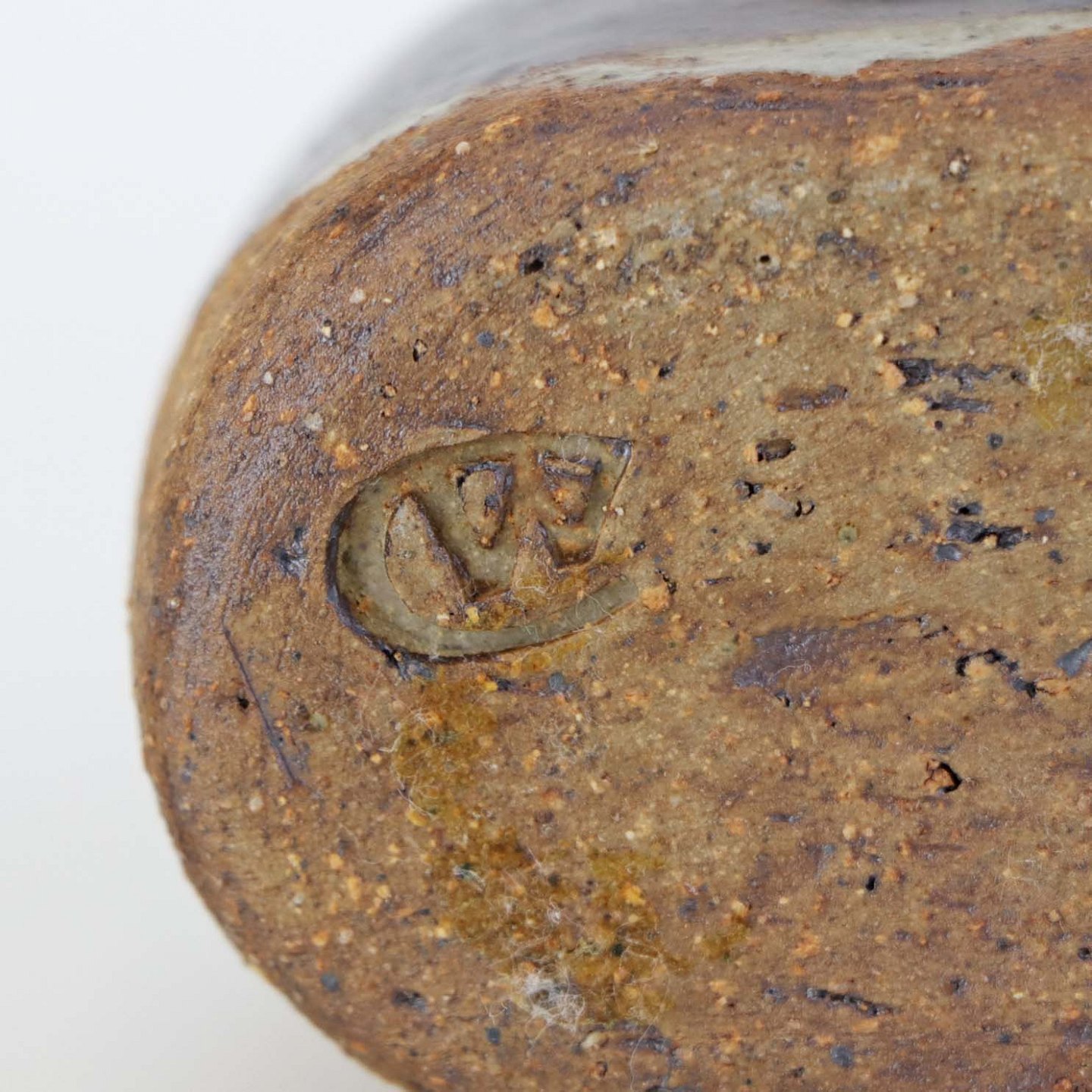 Lille flaskeformet vase i keramik med flerfarvet glansfuld og mat glasur.