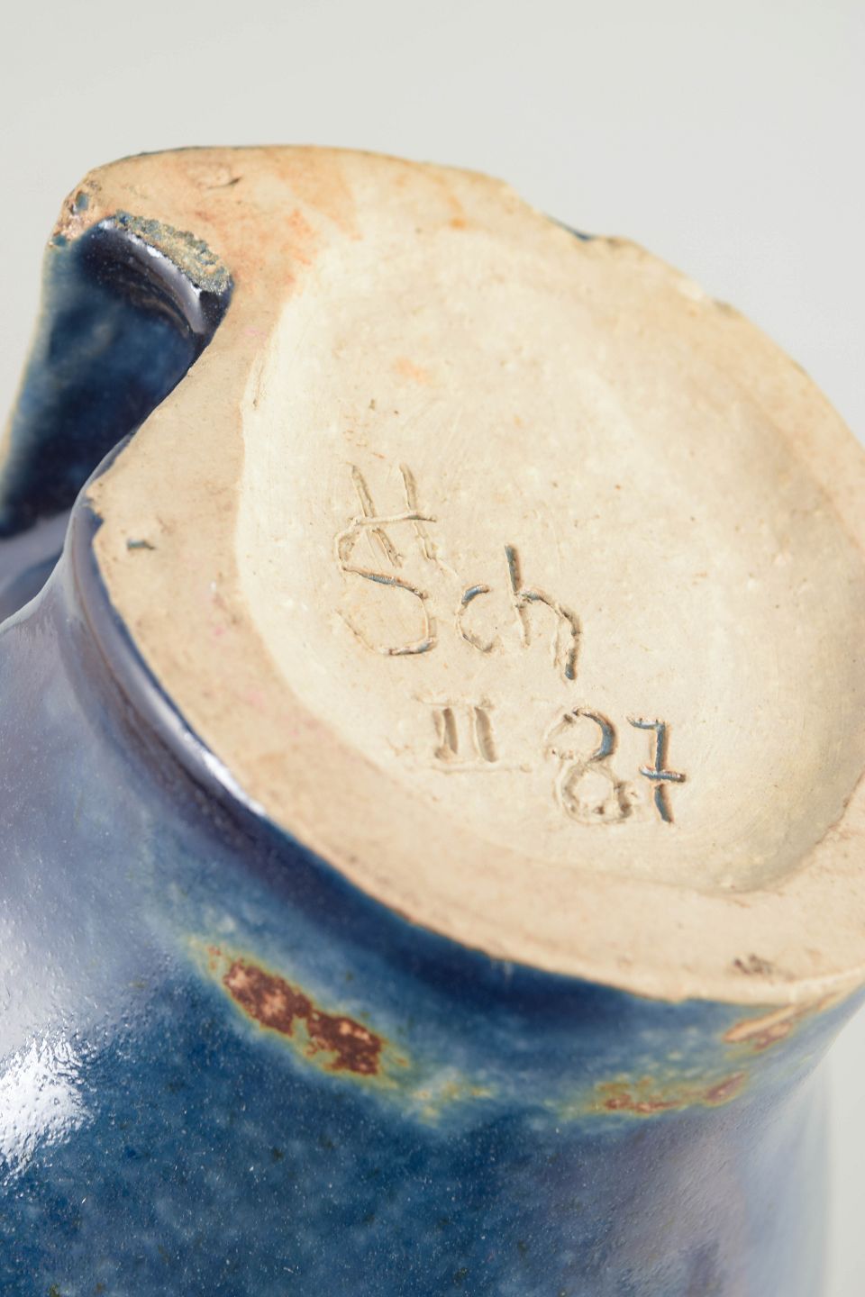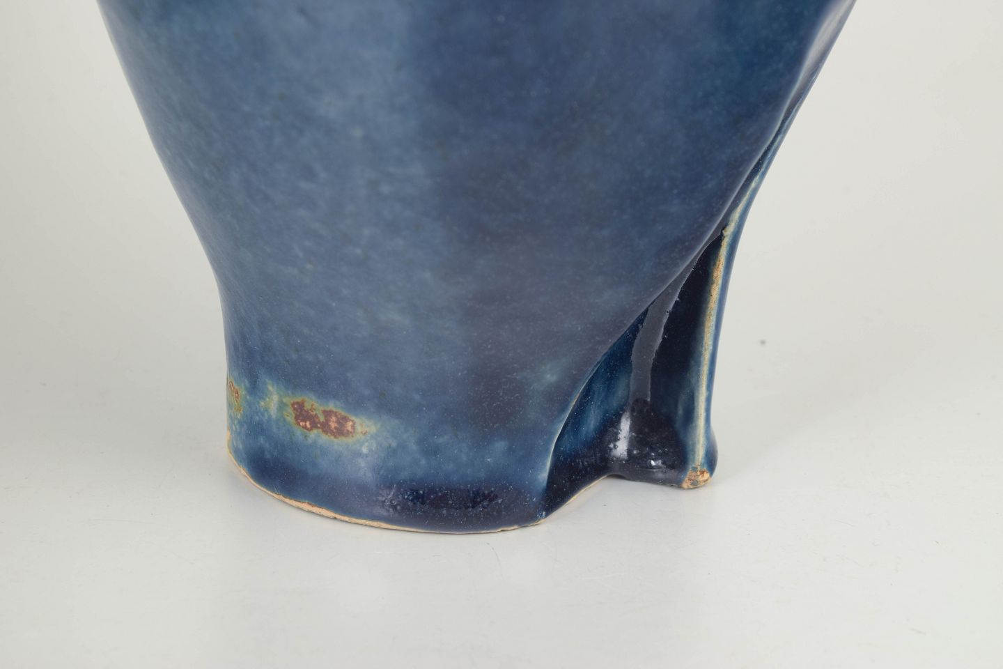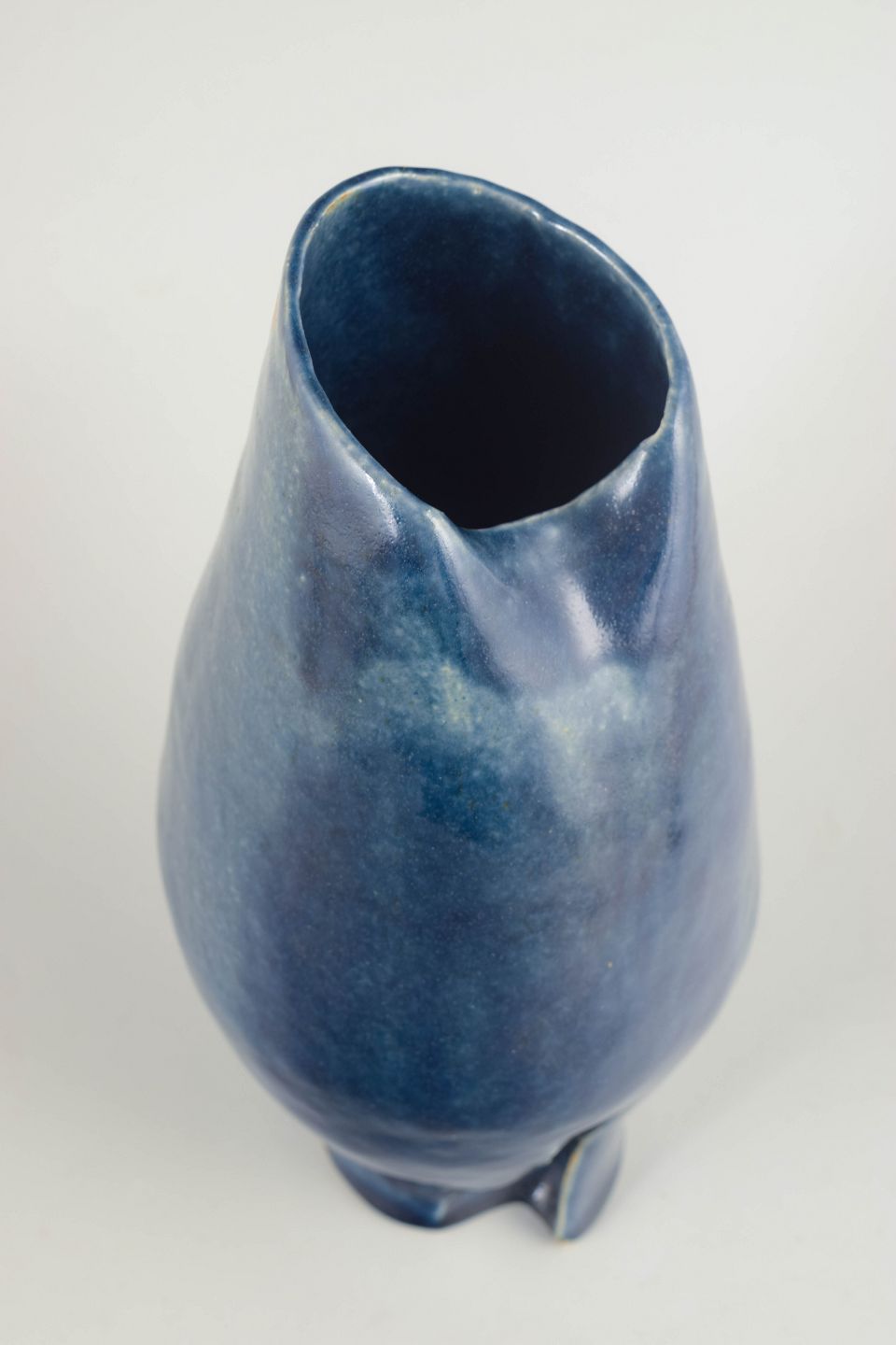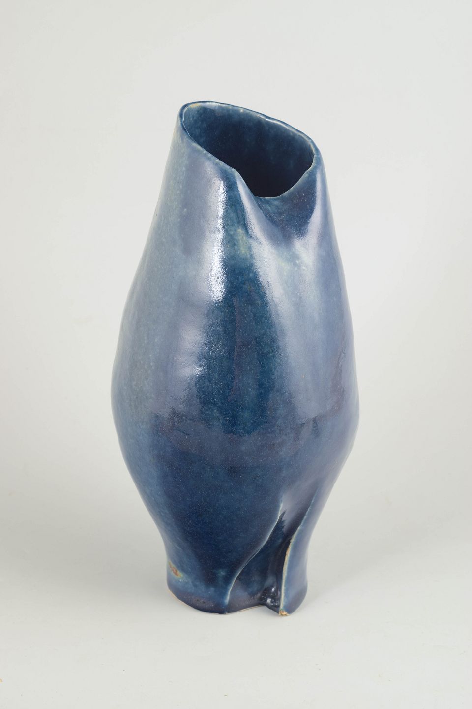 Skulpturelt udformet vase i stentøj med dybblå, let levende glasur og organisk, asymmetrisk åbning. Signeret og dateret 1987.