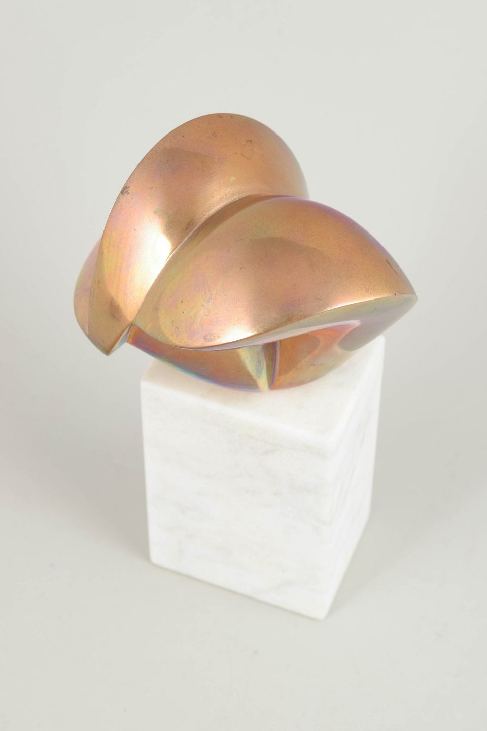 Abstrakt, organisk formet skulptur i massiv bronze med varm, nuanceret patina, monteret på rektangulær marmorsokkel. Skulpturen er signeret og nummereret 2/9.
