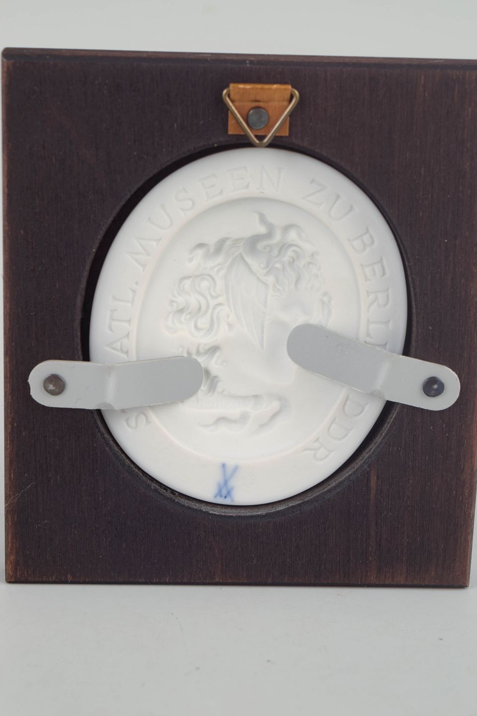 Lille reliefplakette i hvid biscuit porcelæn med klassisk profilportræt, monteret i kvadratisk træramme med ovalt udsnit. Den matte biscuit overflade giver motivet et fint, skulpturelt præg og fremhæver den bløde modellering af ansigt og hår.
