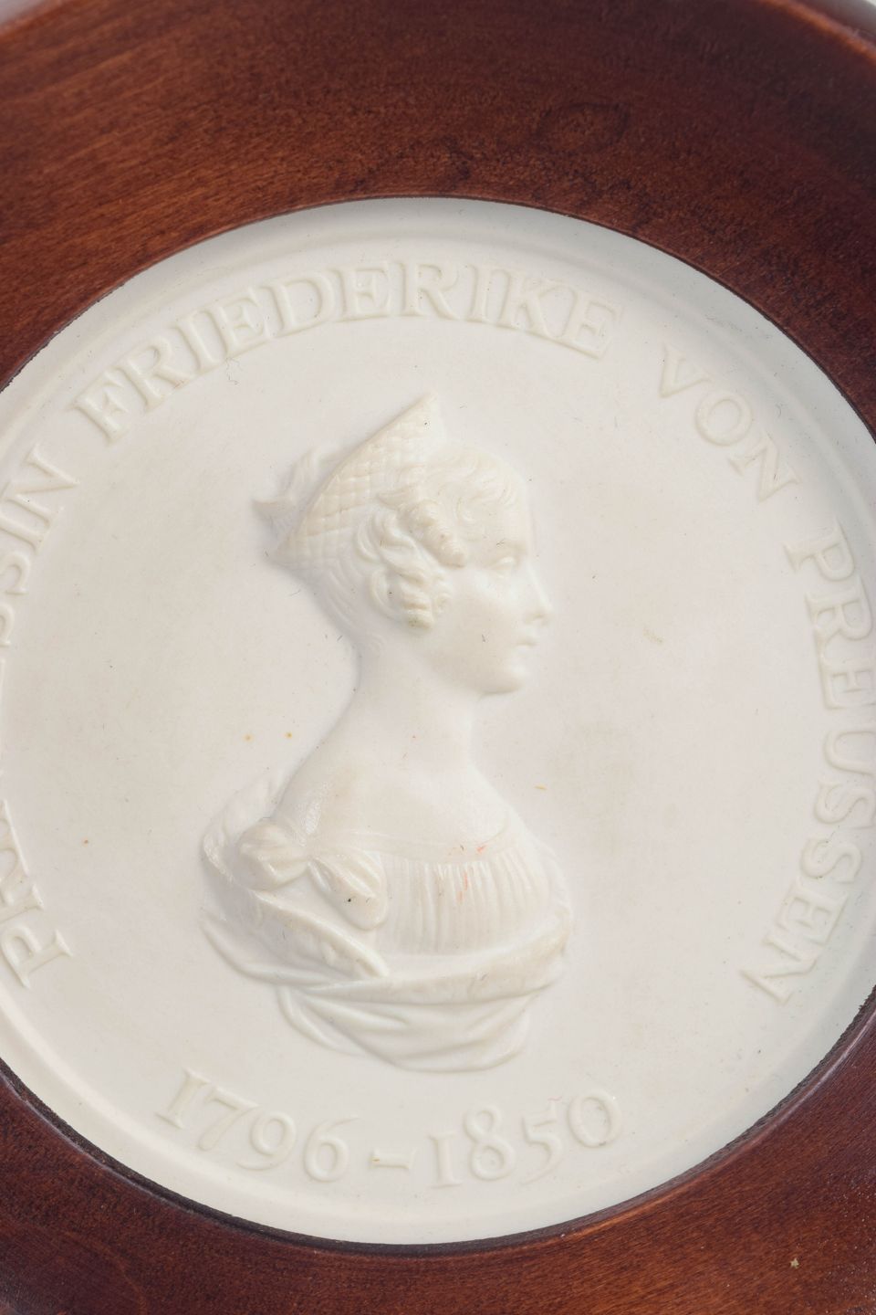Rund reliefplakette i hvid biscuit porcelæn med klassisk profilportræt og cirkulær indskrift, monteret i bred, rund træramme. Udført som en neoklassisk, medalje lignende komposition, hvor den matte biscuit overflade fremhæver de fine detaljer i portrættet.