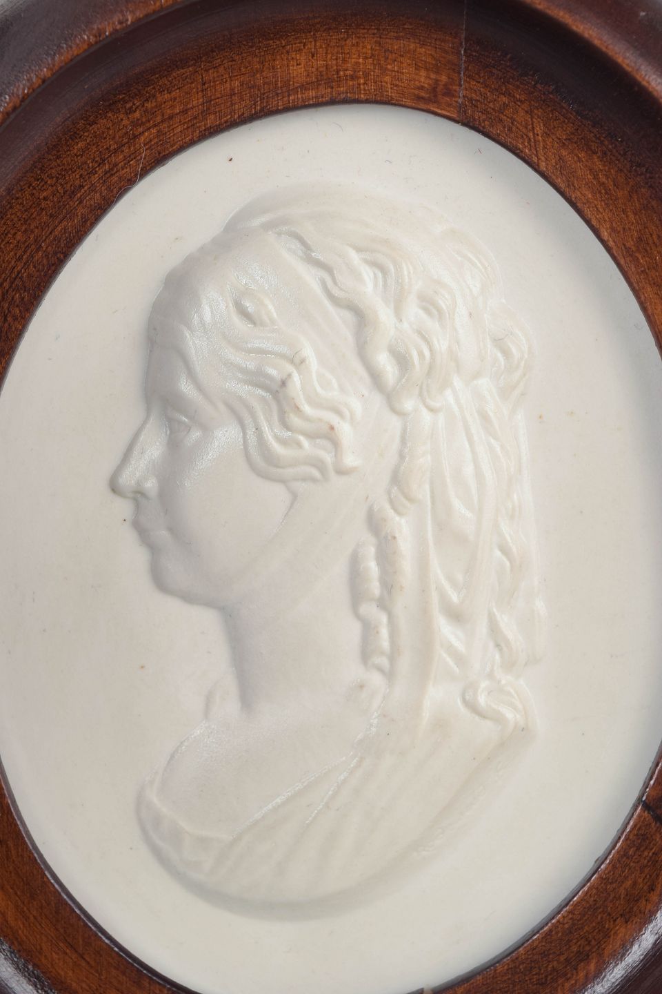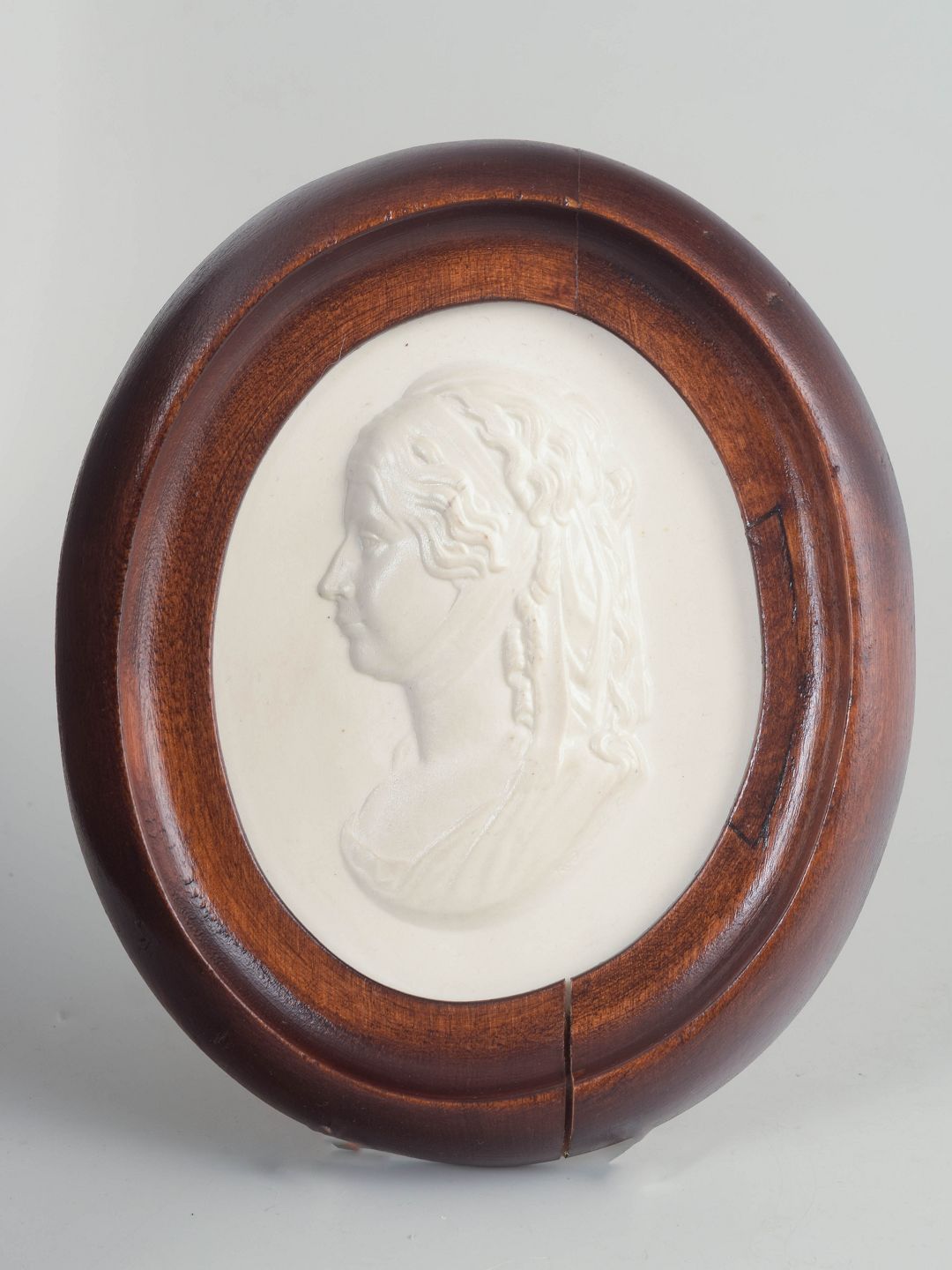 Oval reliefplakette i hvid biscuit porcelæn med klassisk profilportræt af kvinde, monteret i profileret oval træramme. Den matte biscuit overflade giver motivet et skulpturelt, kamee lignende udtryk med fine, bløde detaljer.