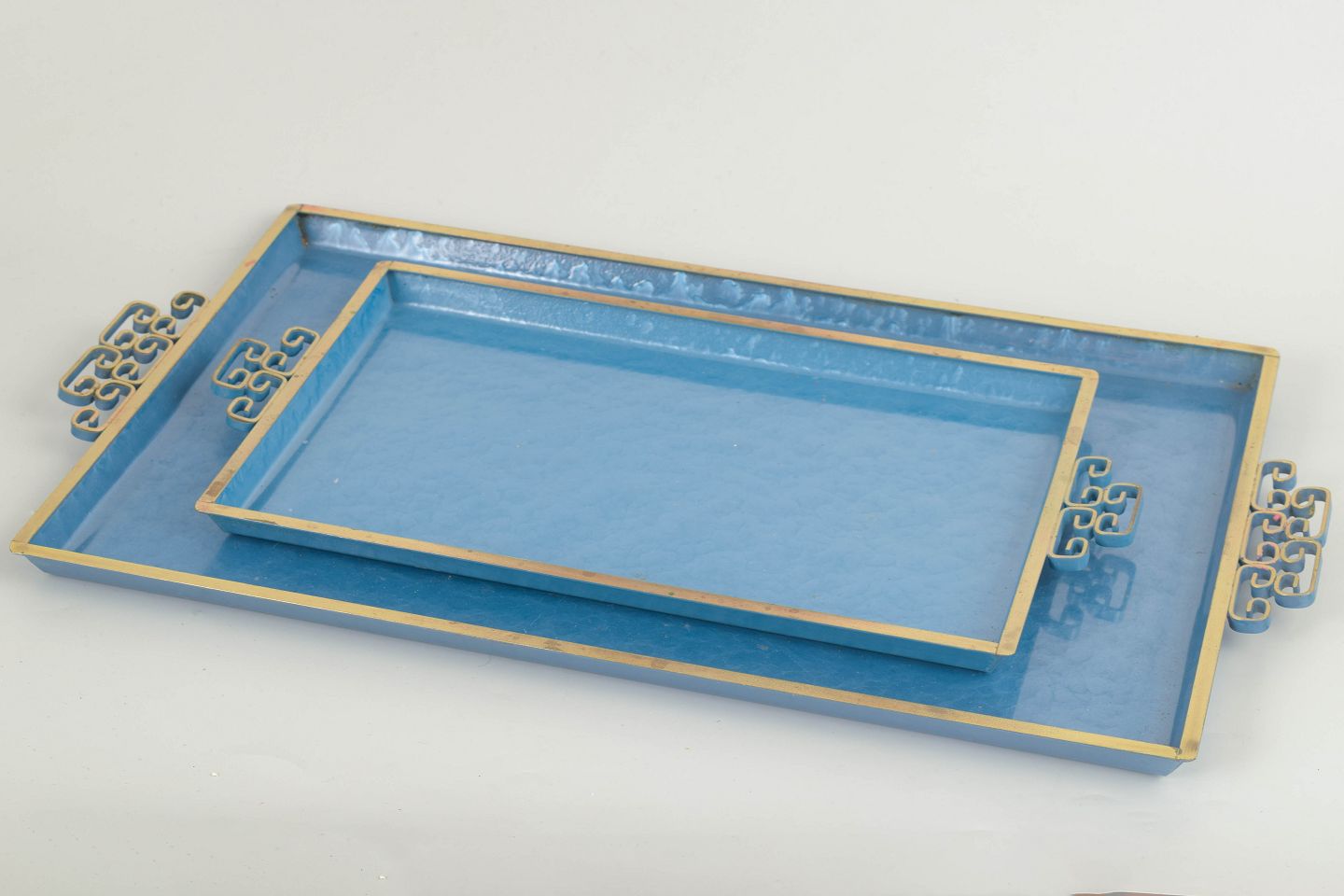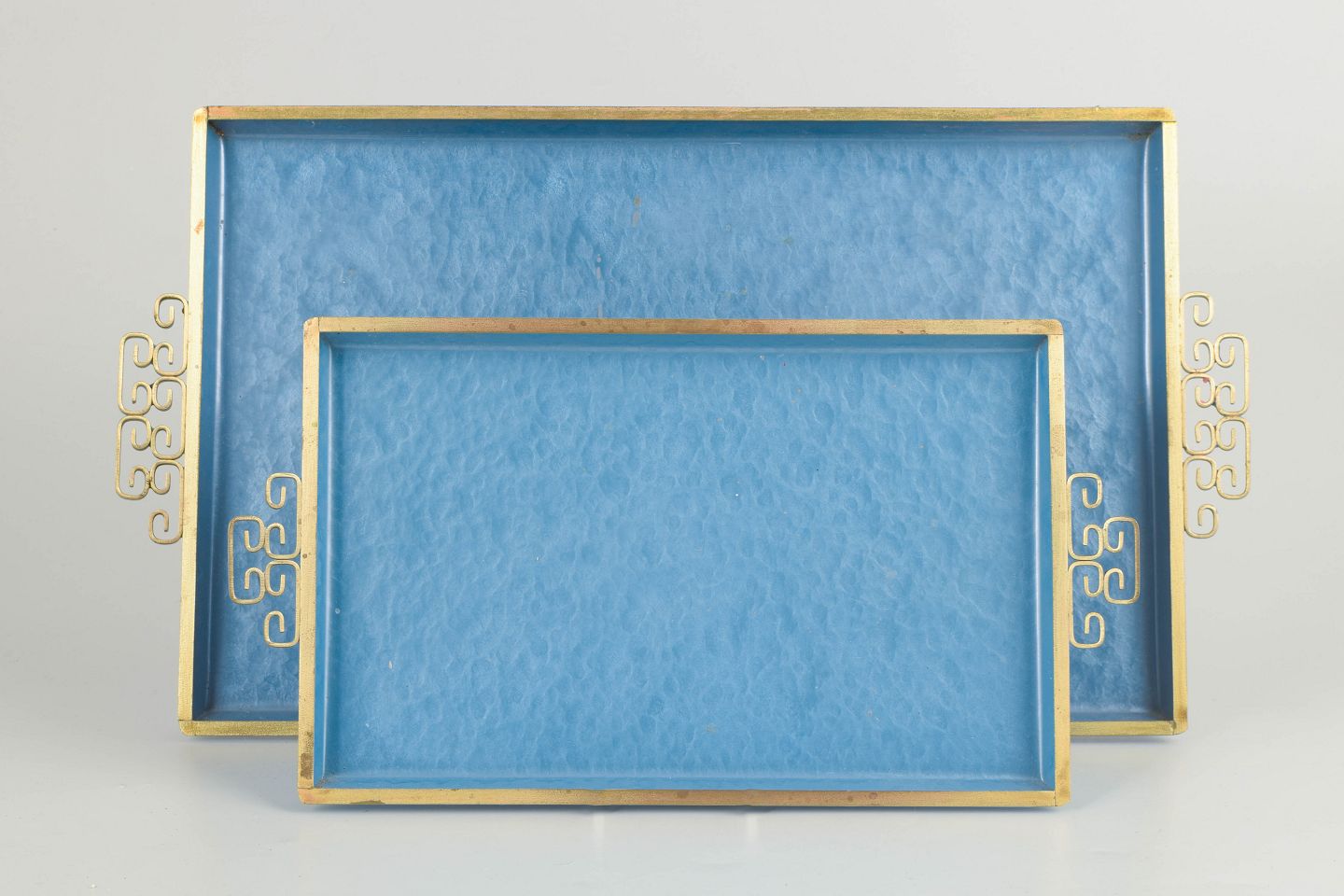 Sæt af håndlavede rektangulære emalje-bakker udført i messing med karakteristisk moiré-glasur i blå nuancer og kant i forgyldt messing. Fremstillet i Pasadena, Californien. Det stringente formsprog og den raffinerede overflade er typisk for Art Deco-periodens dekorative kunst.