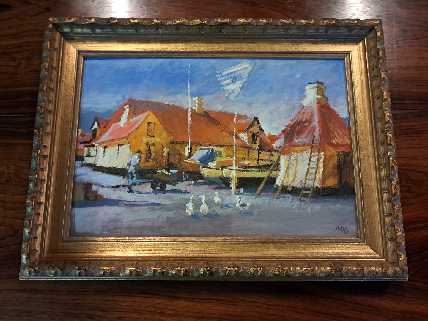 Maleri af Dragør Havn i guldmalet ramme, af : Mogens Amdi Thorsen (1924-2016)